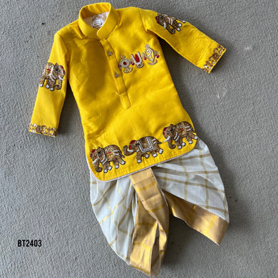 • BT2403 Yellow Boys Kurta with Elephant Embroidery & Golden Dhoti – Traditional Festive & Wedding Outfit