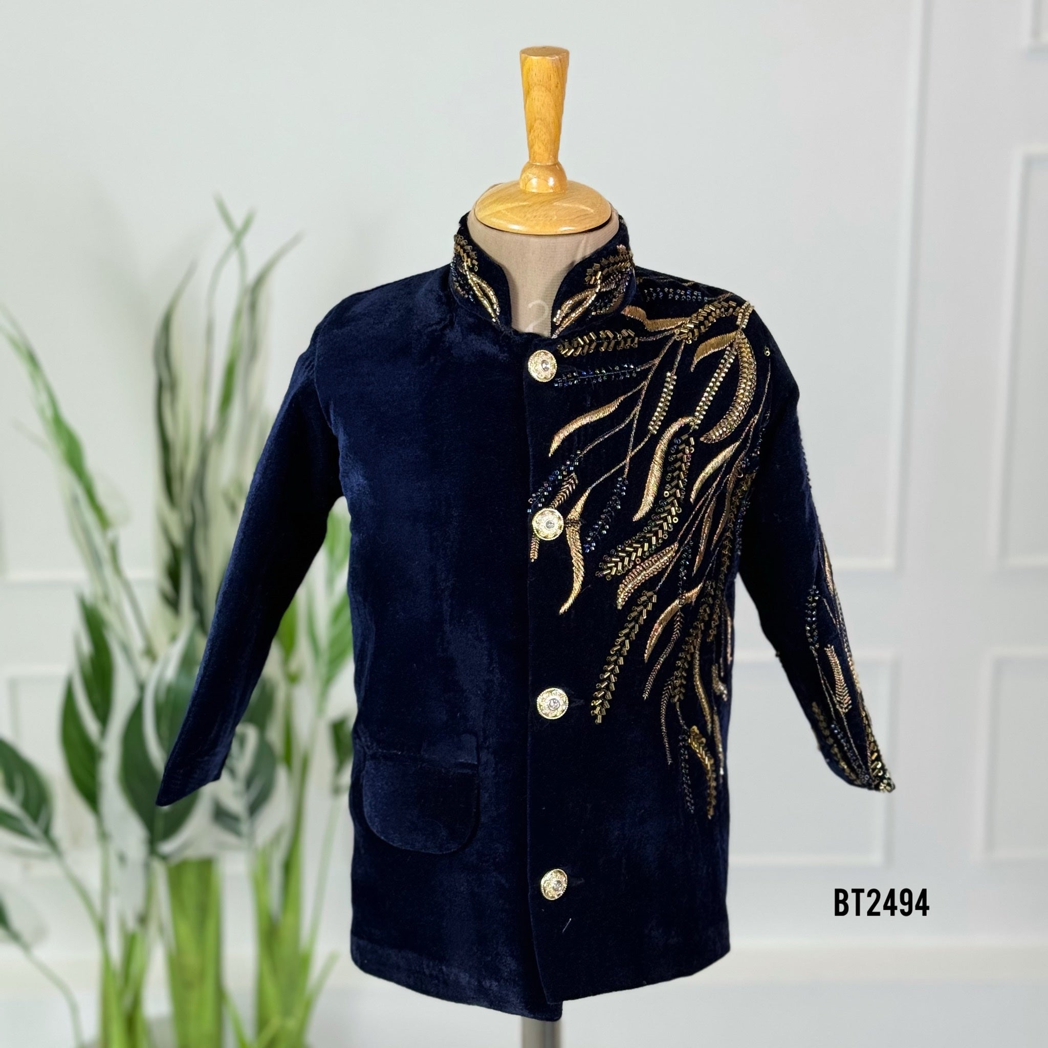 Let your little prince glow with grandeur in our BT2494 Midnight Luxe Jodhpuri Suit 💙✨. Crafted from plush navy velvet, this masterpiece features exquisite golden thread embroidery that flows like royal vines — radiating elegance and festive charm.