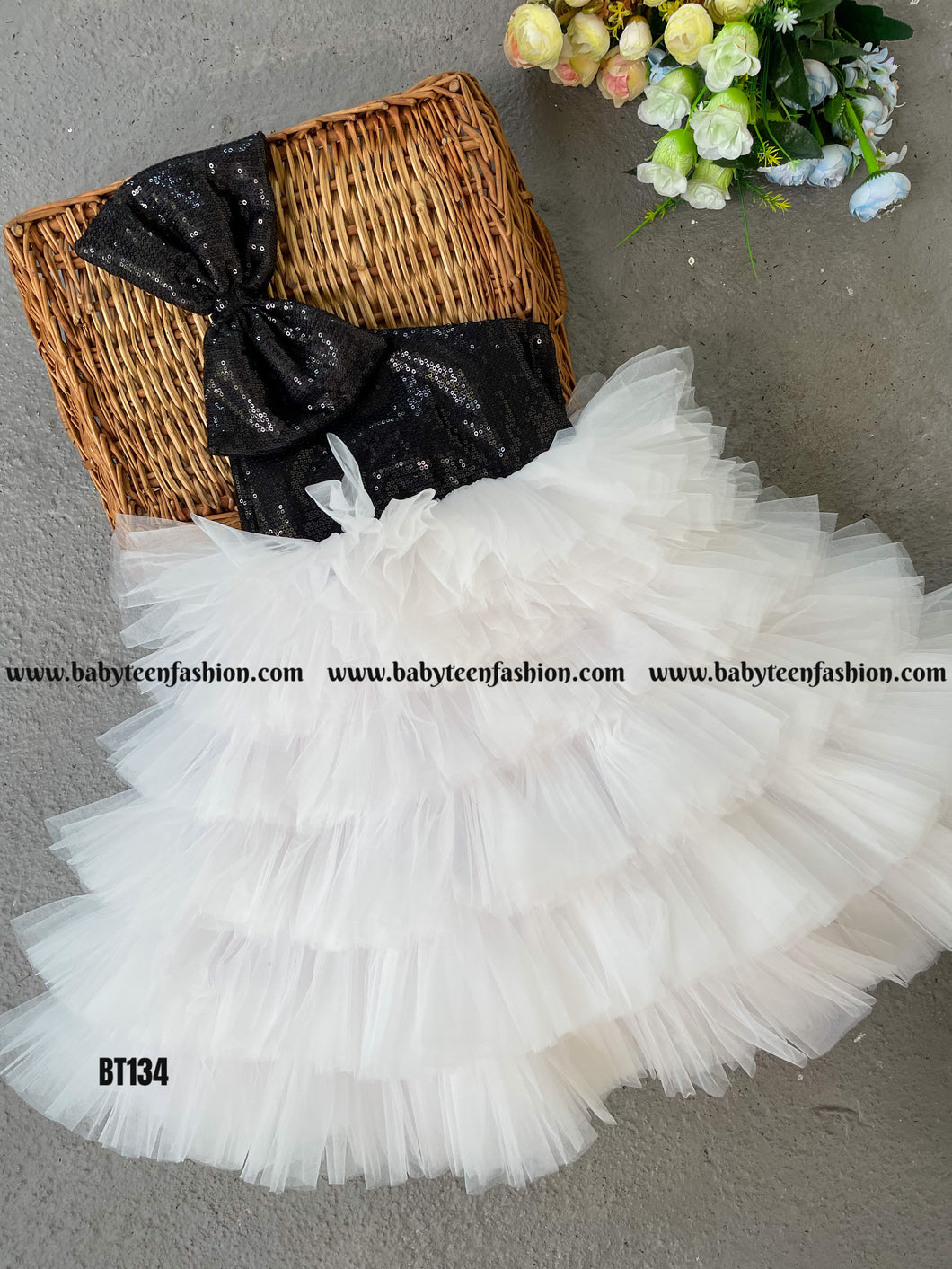 Elegant Contrast: The bold black sequin top transitions to a pure white ruffle skirt, creating a stunning visual contrast.