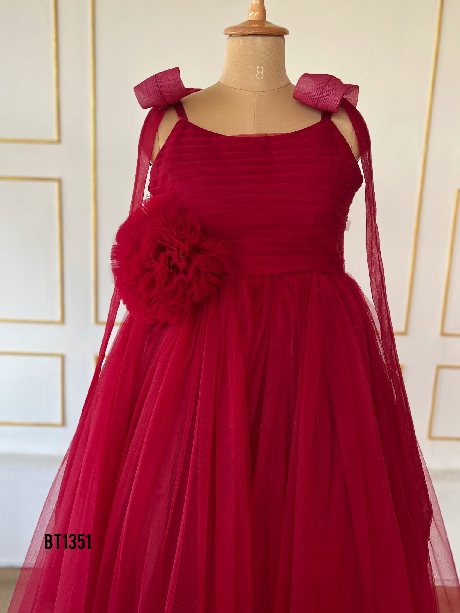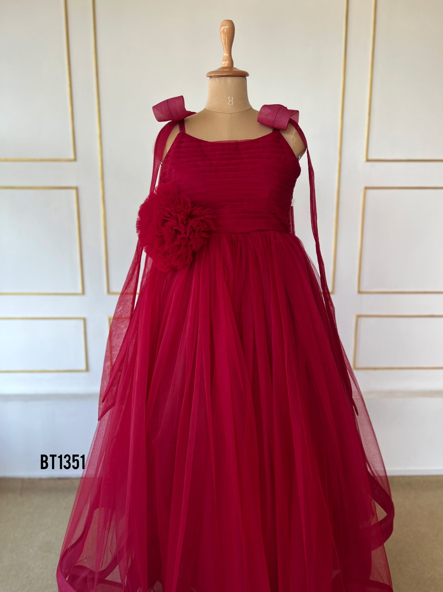 🎀 For Your Little Fashionista (BT1351): Dress your angel in the color of love with our captivating crimson gown. Tailored to make her feel like a fairy tale princess, this dress features delicate ruching on the bodice, flowing into a voluminous tulle skirt. Adorned with playful pom-poms and bows that dance with her every move, it's perfect for birthday parties, family gatherings, or any time she wants to feel extra special. 🌟👗