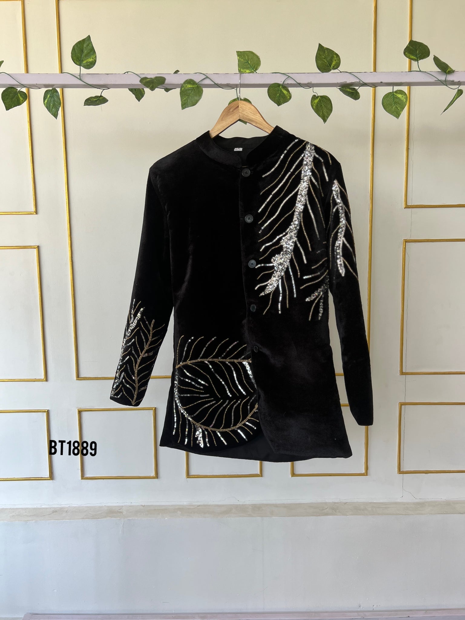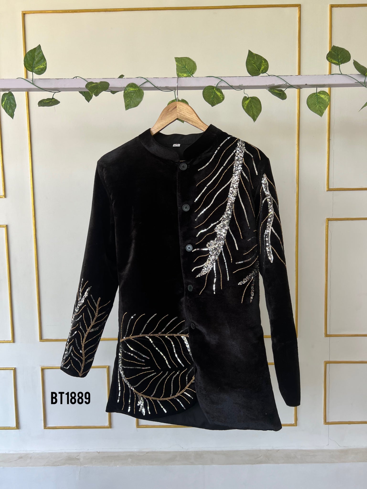 Step up your style with our Black Velvet Jacket with Gleaming Embroidery for Dad, designed for fathers who appreciate elegance with a hint of glamour. Crafted from luxurious velvet, this jacket is adorned with intricate sequin and thread embroidery that flows gracefully like abstract feathers across the sleeve and front panel. Perfect for weddings, gala nights, or festive gatherings, this ensemble ensures dad shines just the right amount in every setting. 🎩💫