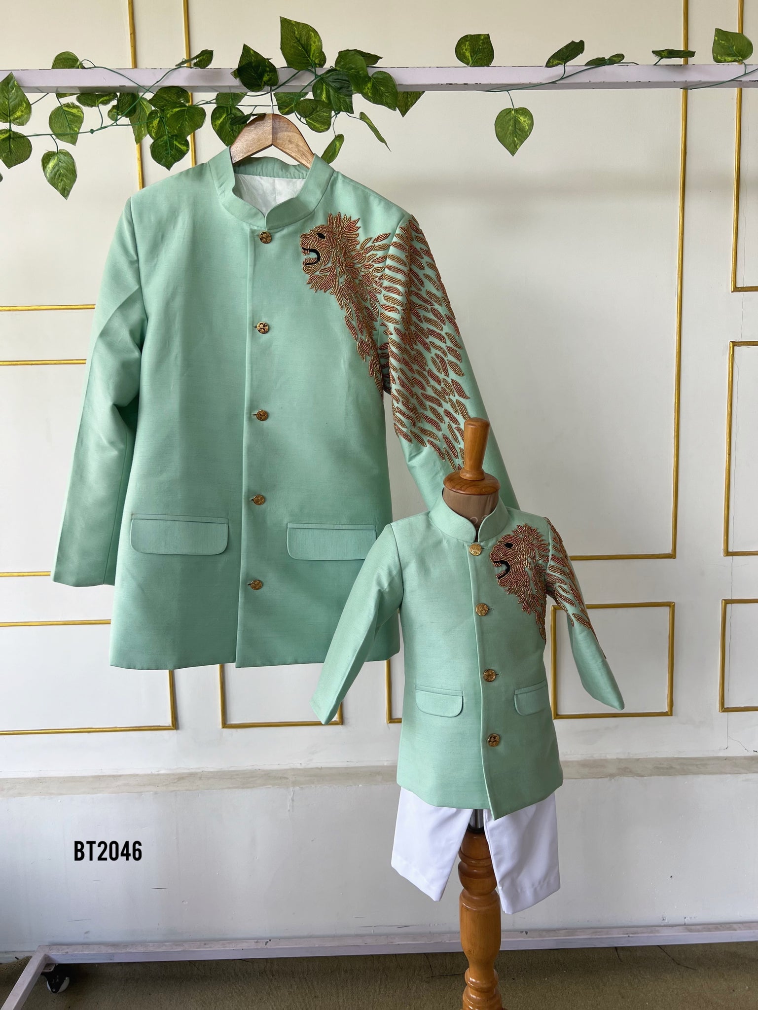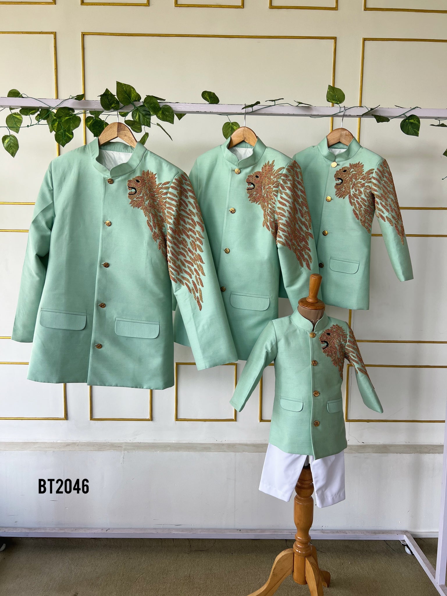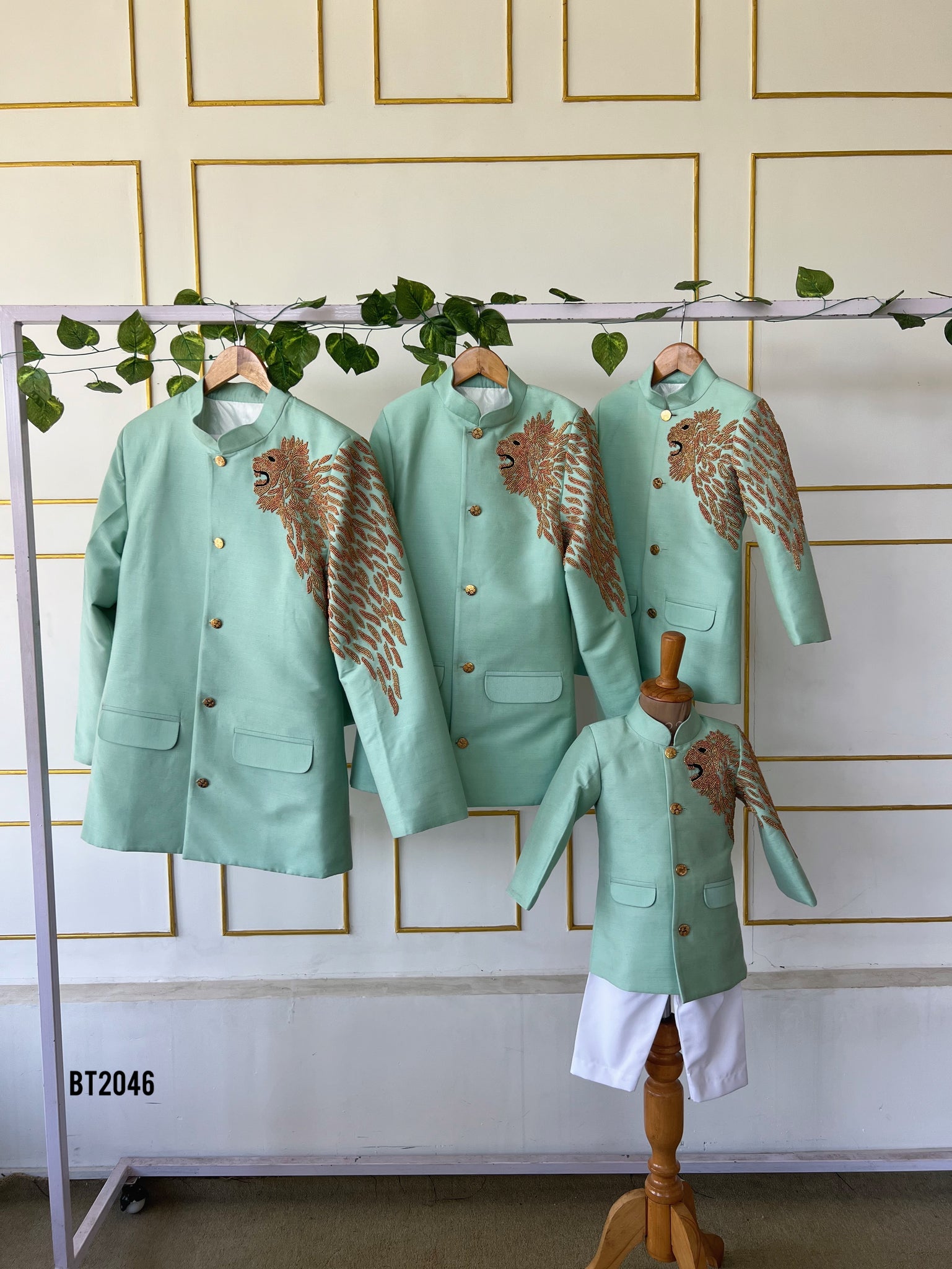Roar into style with our Lion King Family Sherwani Set 🦁✨! This majestic outfit is designed for the whole family to step into celebrations with a royal touch. The intricate lion embroidery and elegant mint green sherwani create an unforgettable look for birthdays, weddings, or any grand family occasion. 🌟 Whether it’s dad and son twinning or the entire family making a statement, this set brings a blend of tradition and modern fashion! 👨👦🎉