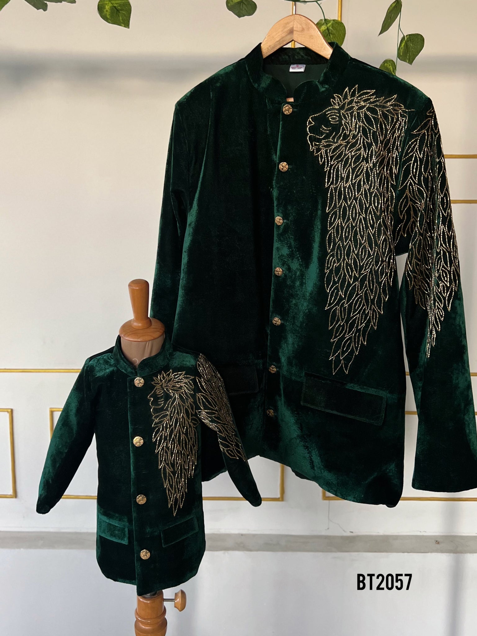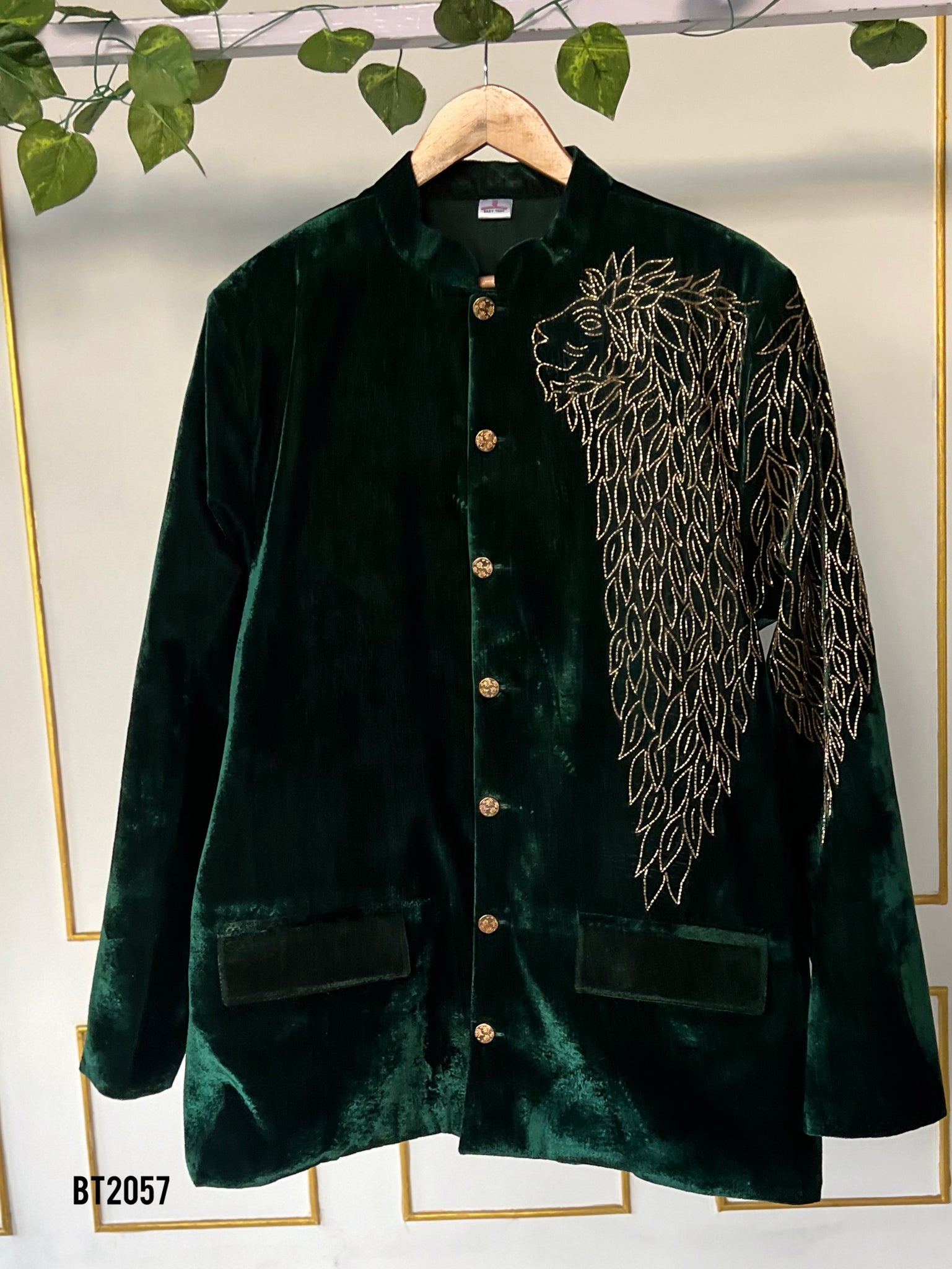 Let your little one roar with elegance in this majestic Velvet Sherwani! Perfect for birthdays, weddings, or any royal-themed celebration, this deep green sherwani features a striking lion embroidery that symbolizes courage and royalty. Designed to make your boy stand out, it combines classic style with modern charm. 🎉👑