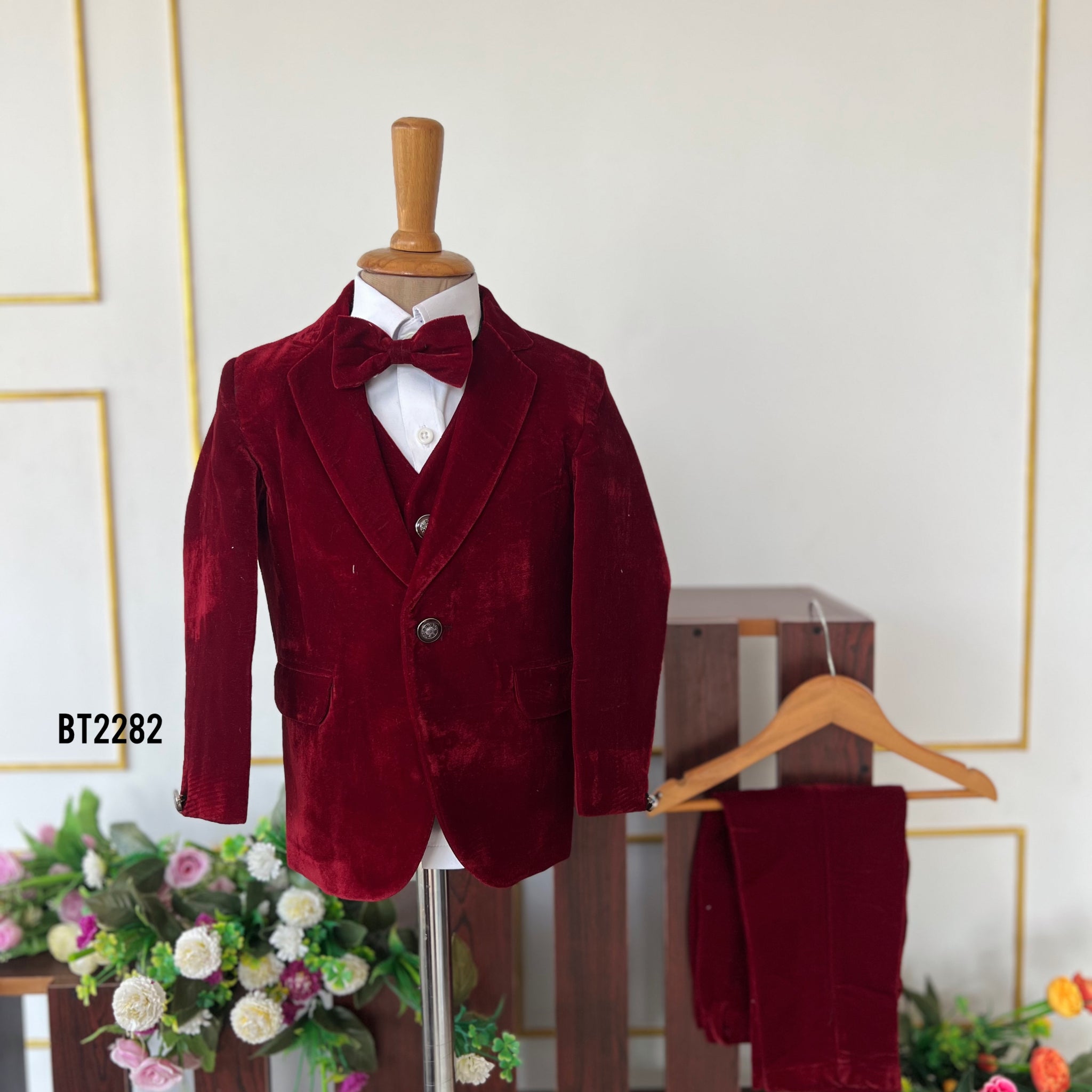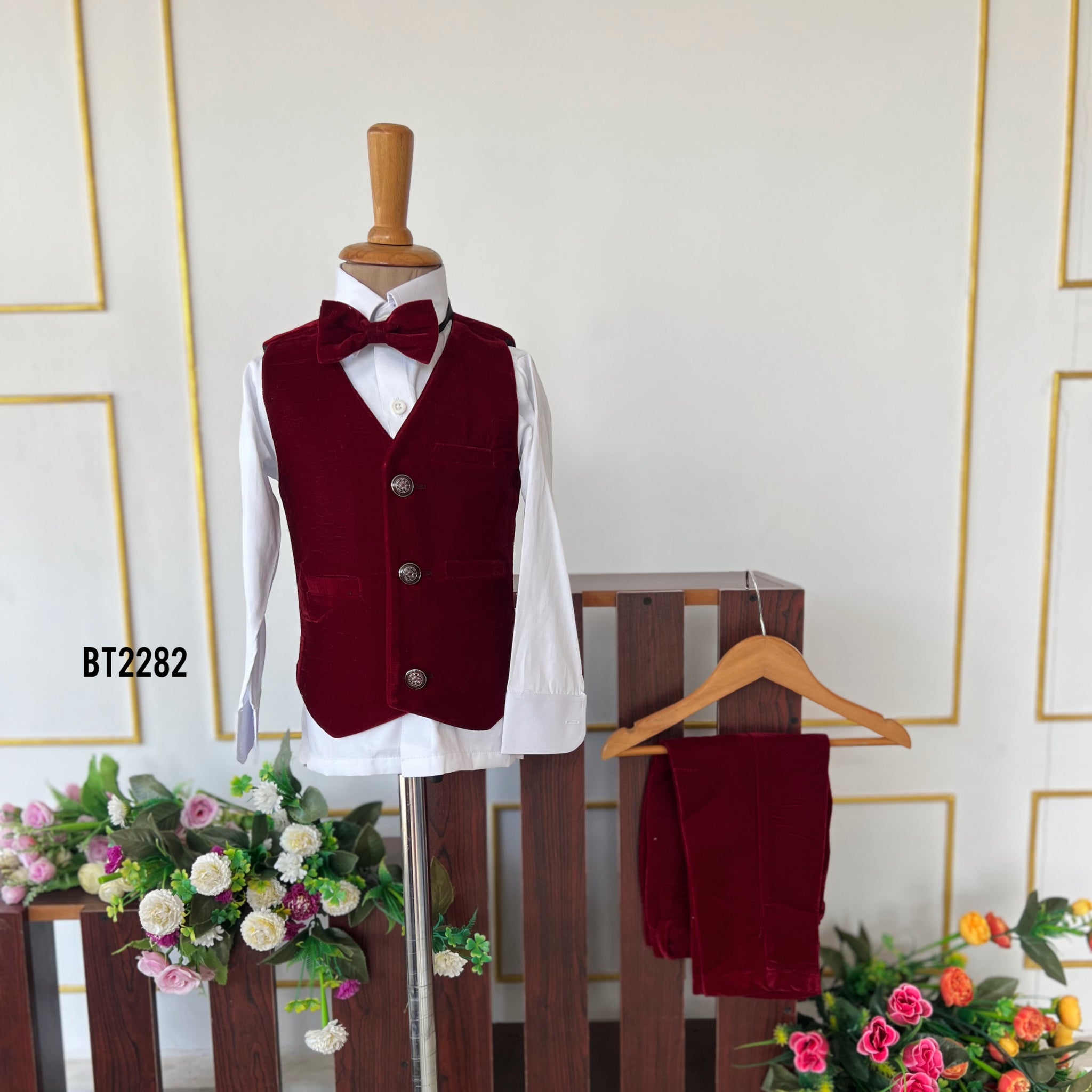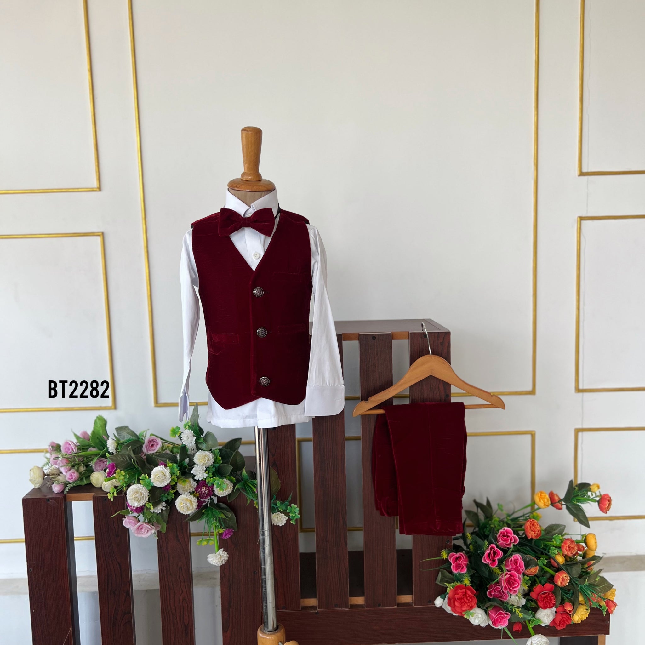 Drape your little one in royal elegance with this deep red velvet suit, tailored for grand celebrations, birthdays, and weddings! Featuring a sharp blazer, fitted trousers, a classic white shirt, and a matching bow tie, this three-piece ensemble is designed for young gentlemen who love to steal the show with their charm and confidence. The rich wine-red velvet fabric adds a touch of luxury, making this outfit the perfect pick for unforgettable moments.
