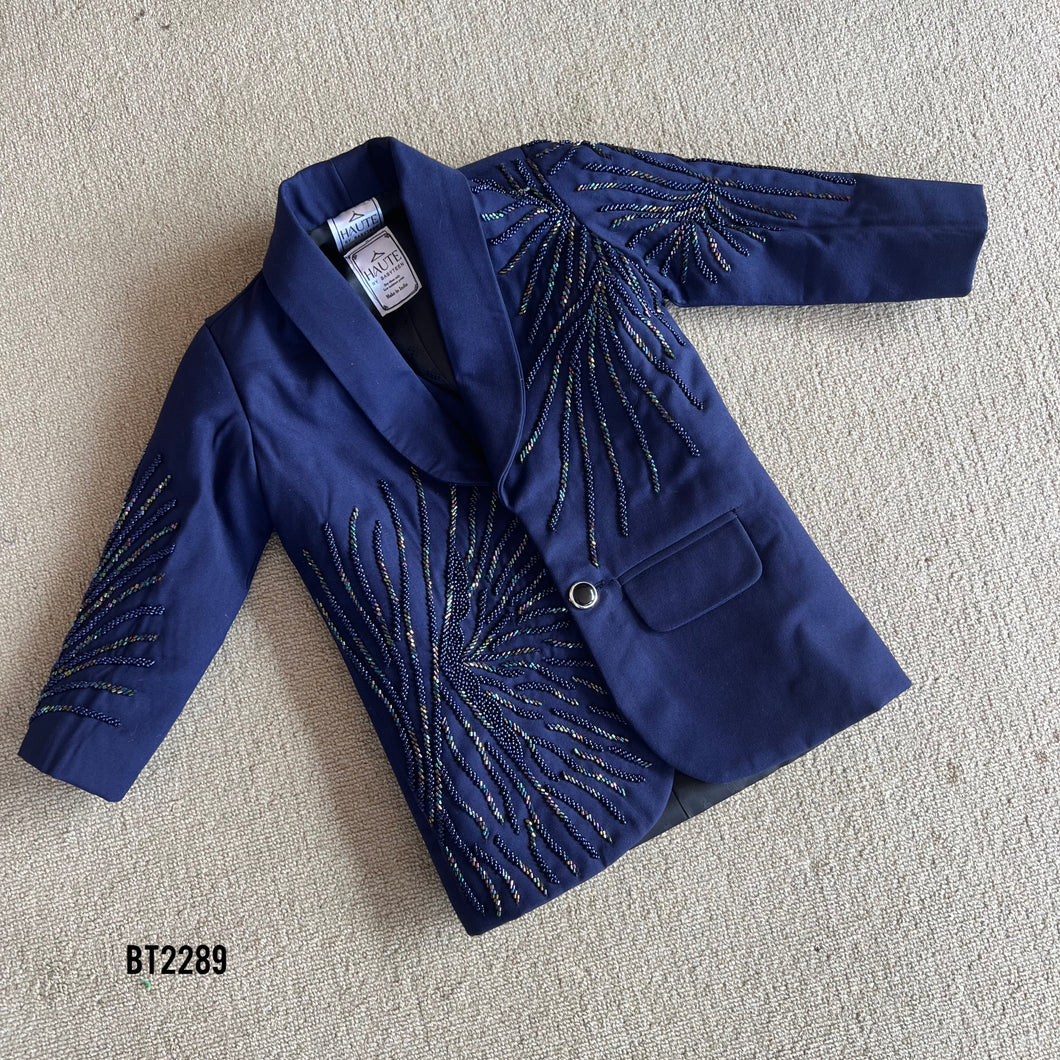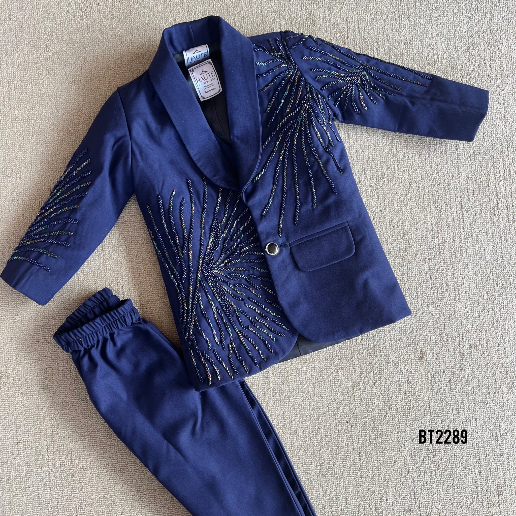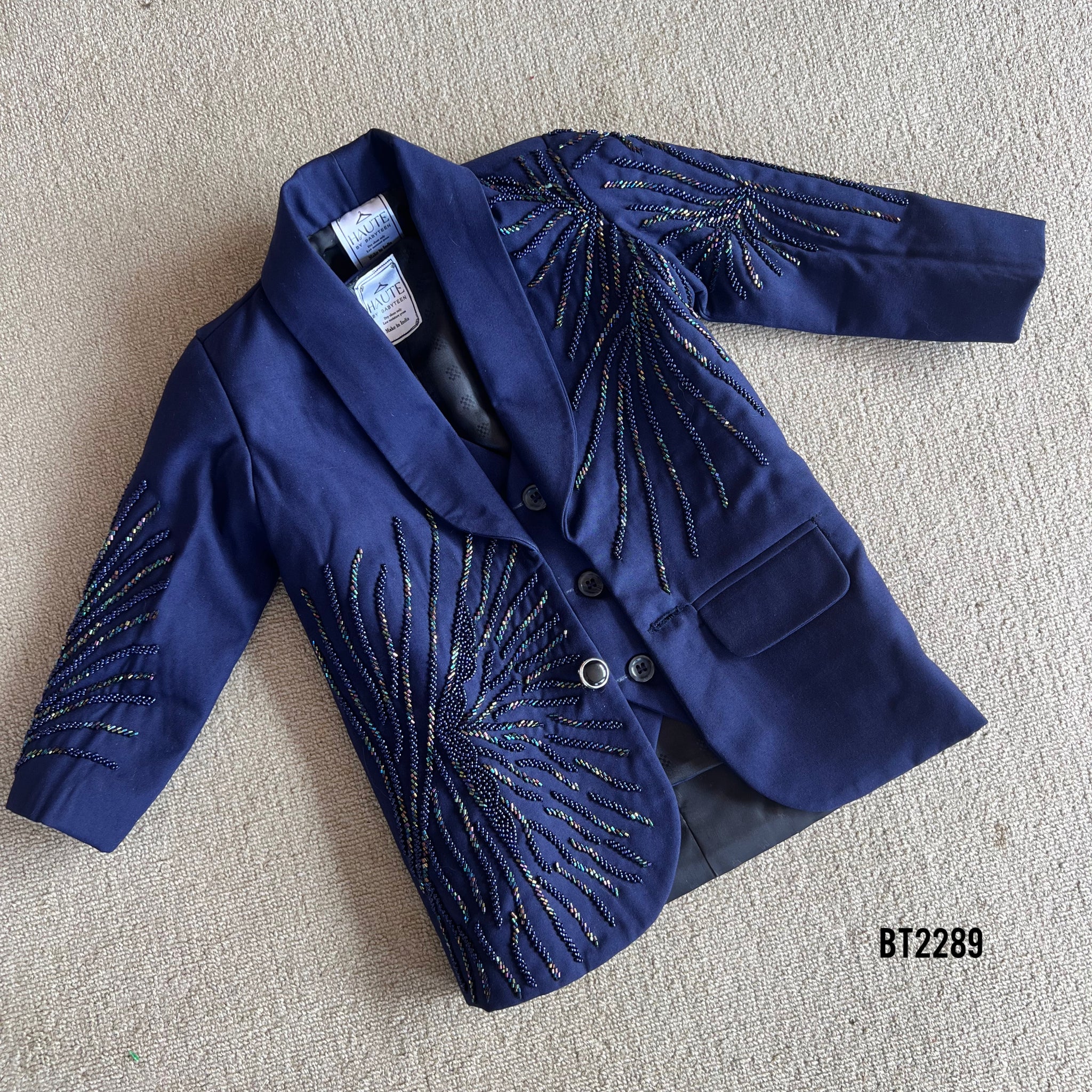 Give your little prince a celestial makeover with this stunning navy blue suit that sparkles like the night sky! โœจ Designed with intricate starburst beadwork, this outfit is made for grand occasions, birthdays, and festive celebrations where he needs to shine the brightest! ๐ŸŒŒ๐Ÿ’™