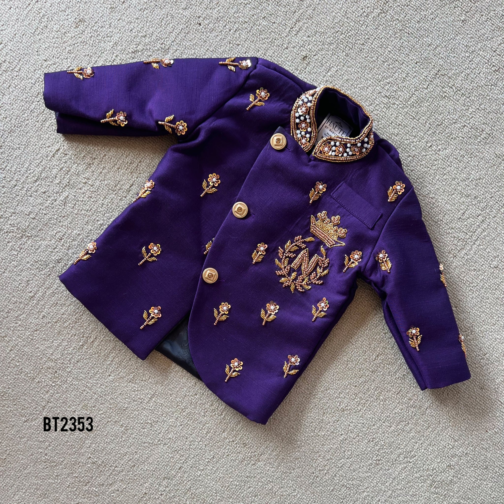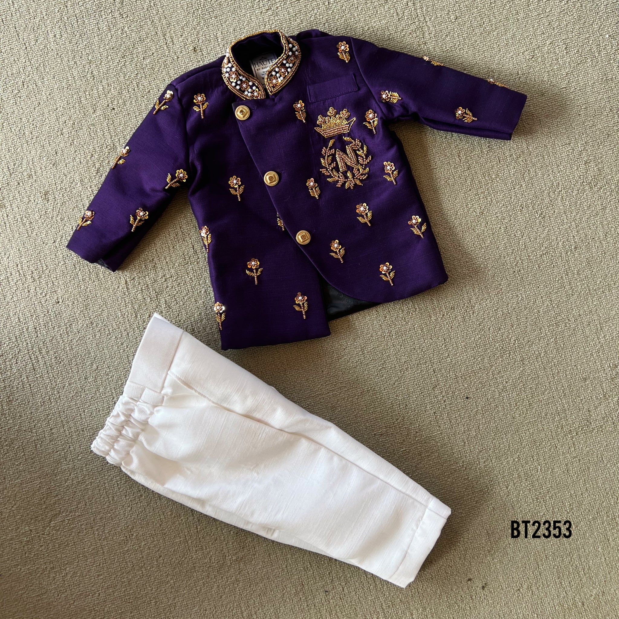 Dress your little king in pure elegance with this royal purple embroidered coat set, paired with crisp white pants 🤍. Designed with golden hand embroidery & jewel-studded collar, this outfit is the ultimate choice for birthdays, weddings & festive celebrations.