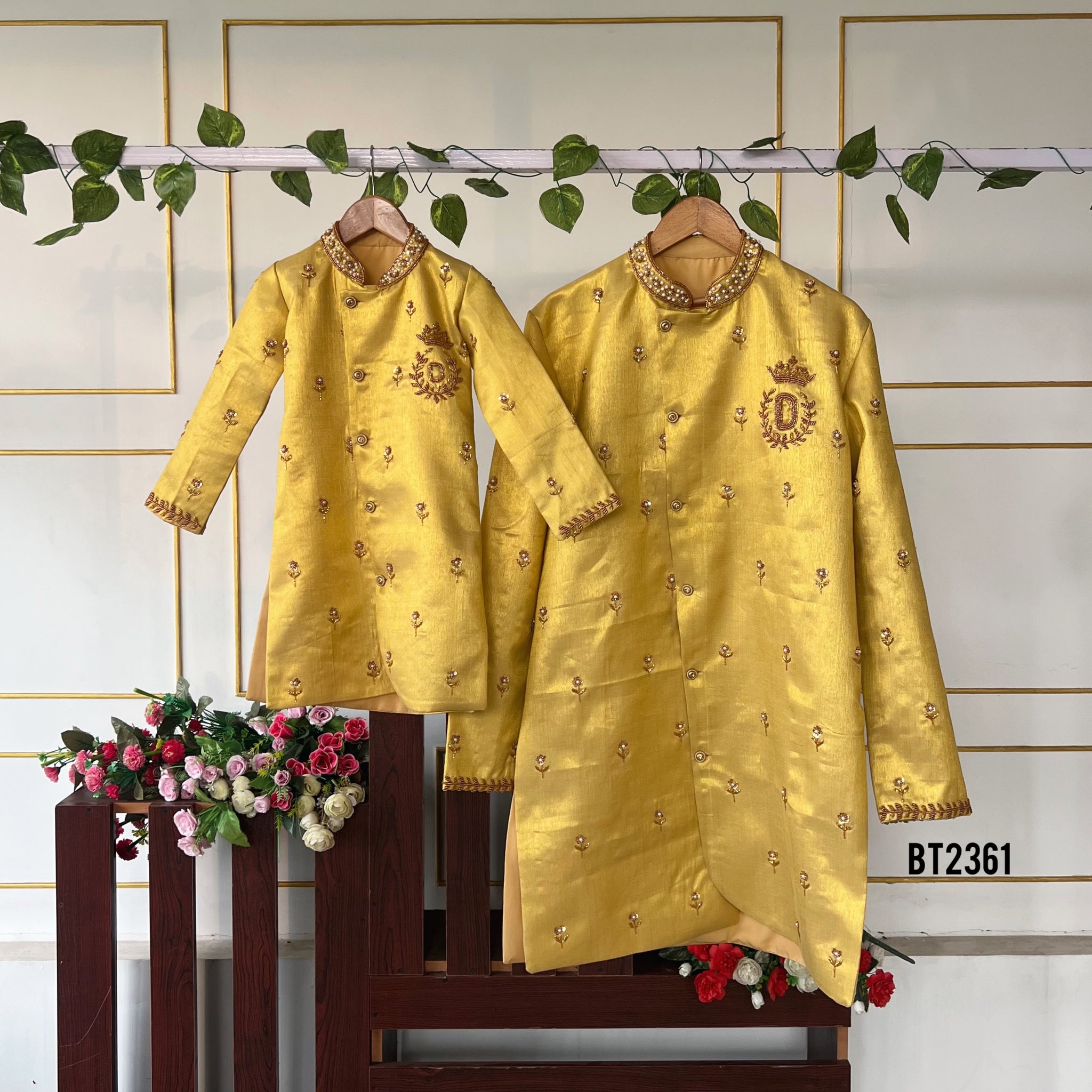 Celebrate togetherness in style 💛❤️ with this Dad-Son twinning combo set. The rich mustard-yellow kurta with delicate embroidery pairs beautifully with the vibrant red silk dhoti, creating a majestic royal look for any grand celebration.