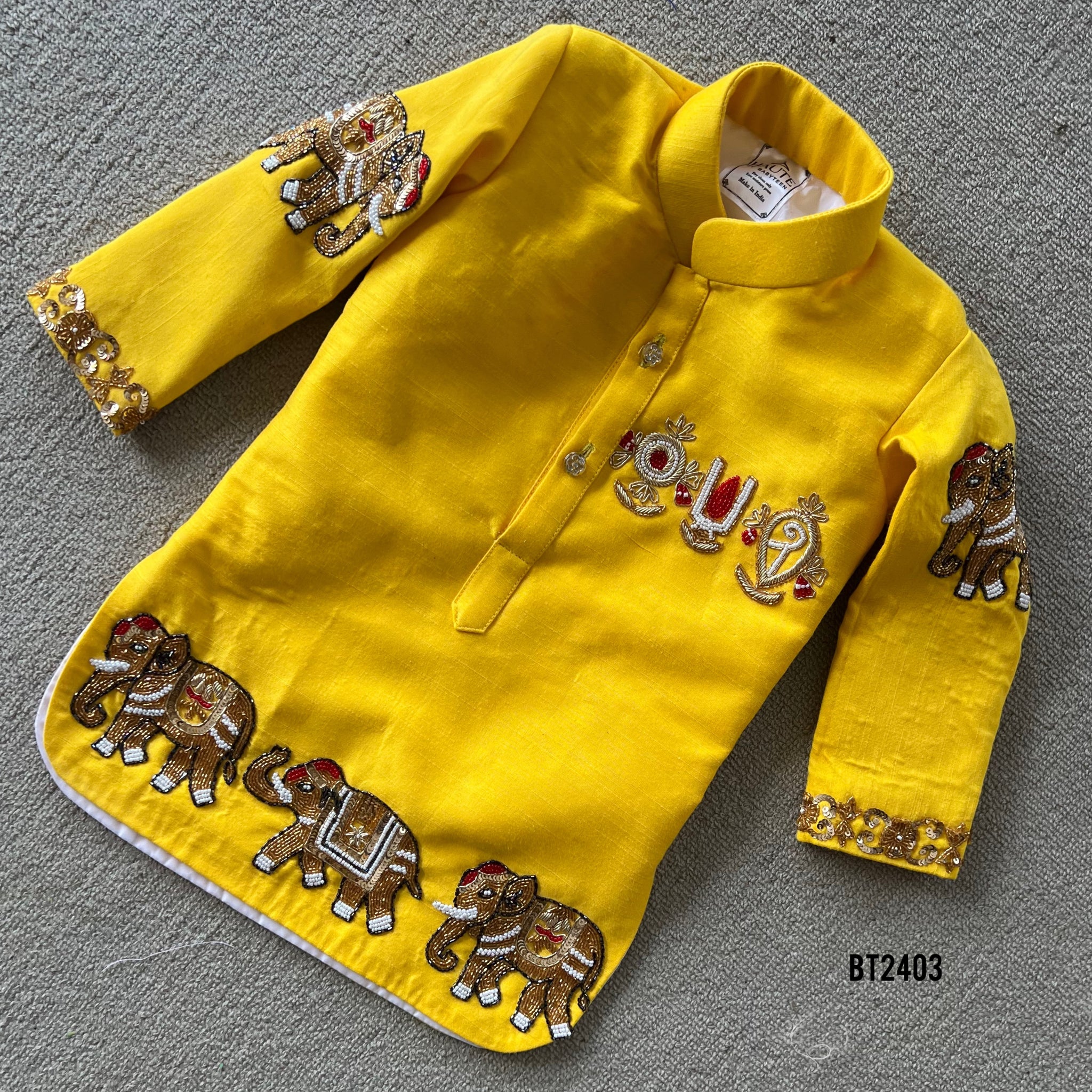 Make your little prince shine in cultural elegance with our Yellow Boys Kurta with Elephant Embroidery & Golden Dhoti 🐘💛 – a festive masterpiece perfect for weddings, poojas, and cultural celebrations.