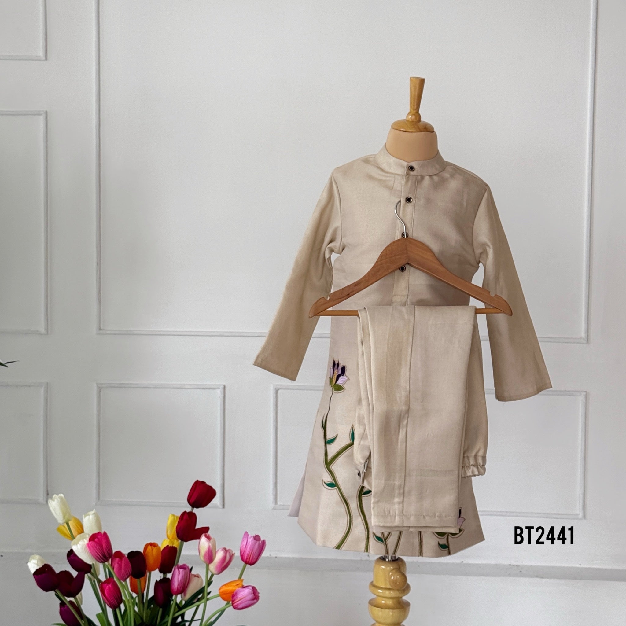 This elegant outfit beautifully combines simplicity with luxury — perfect for birthdays, cultural functions, weddings, or festive family photoshoots. The minimal collar design and delicate embroidery at the hem add a sophisticated touch that makes your baby stand out effortlessly 💫