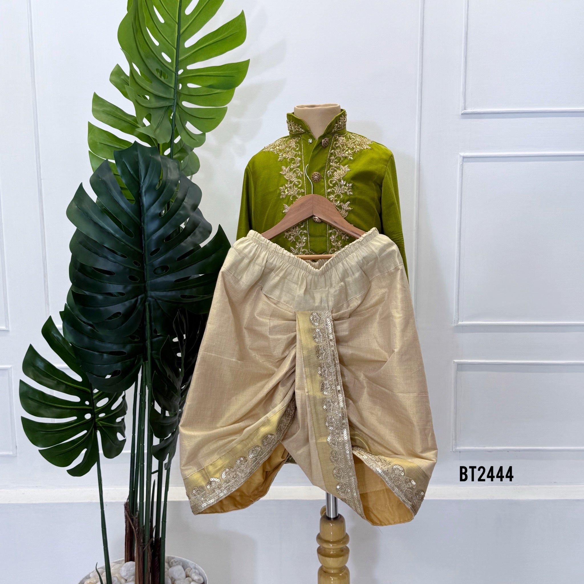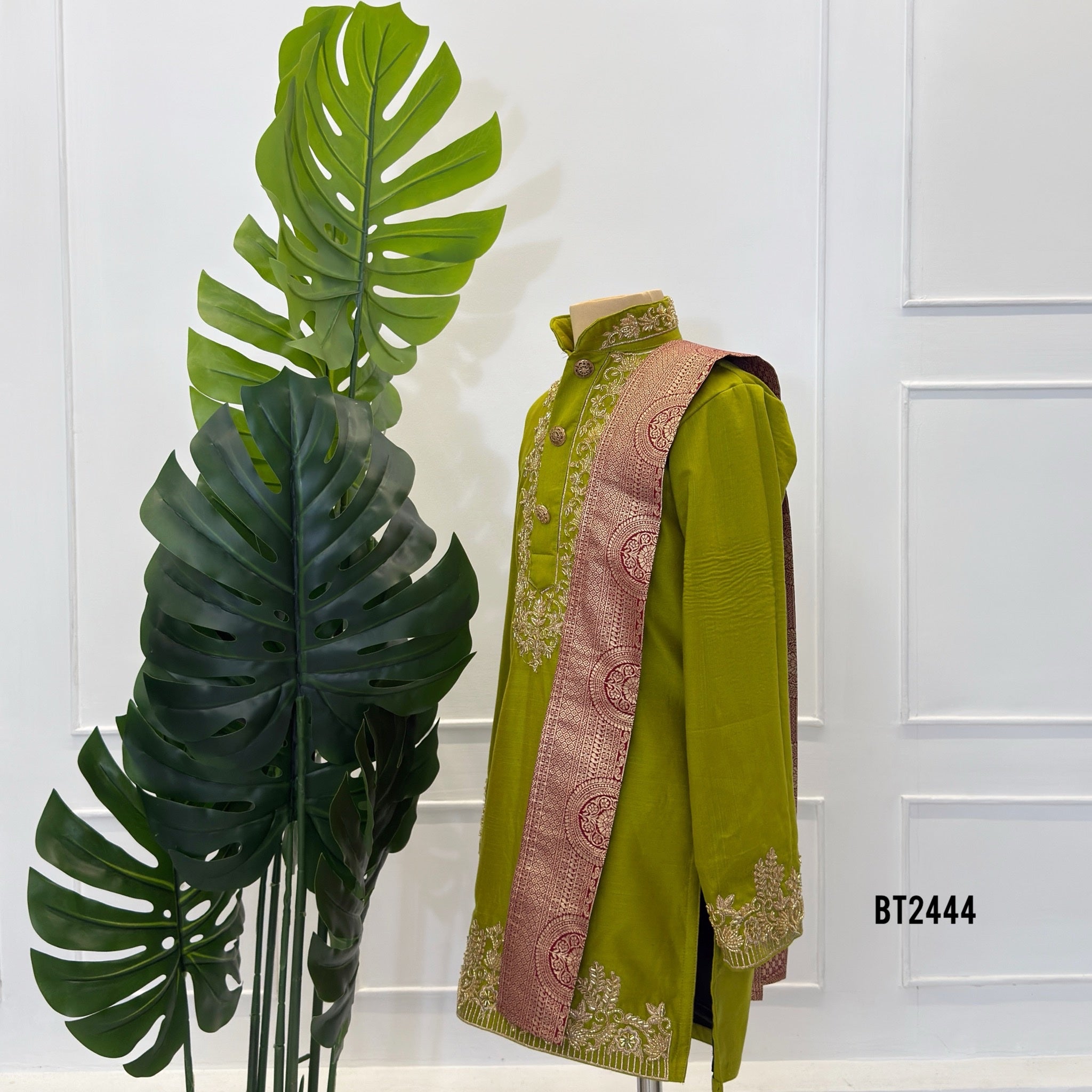 Bring a royal glow to your little prince’s celebration with this BT2444 Designer Baby Boy Party Wear Kurta Set, crafted in a rich olive green hue and paired with an elegant golden dupatta 💚👑