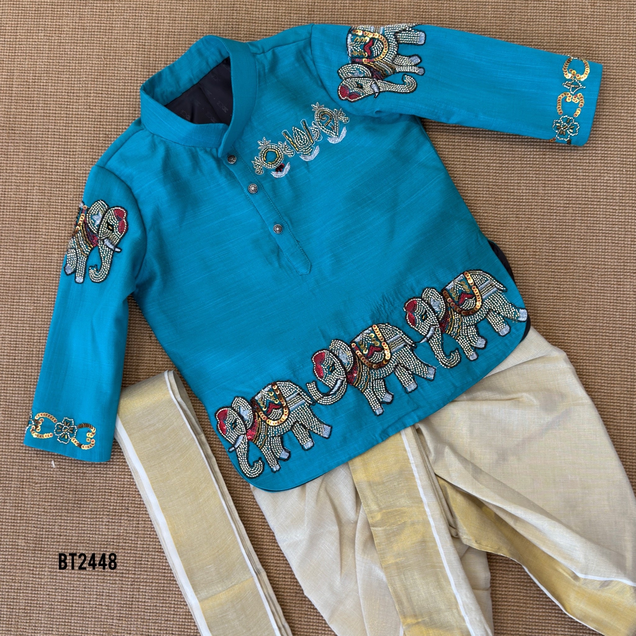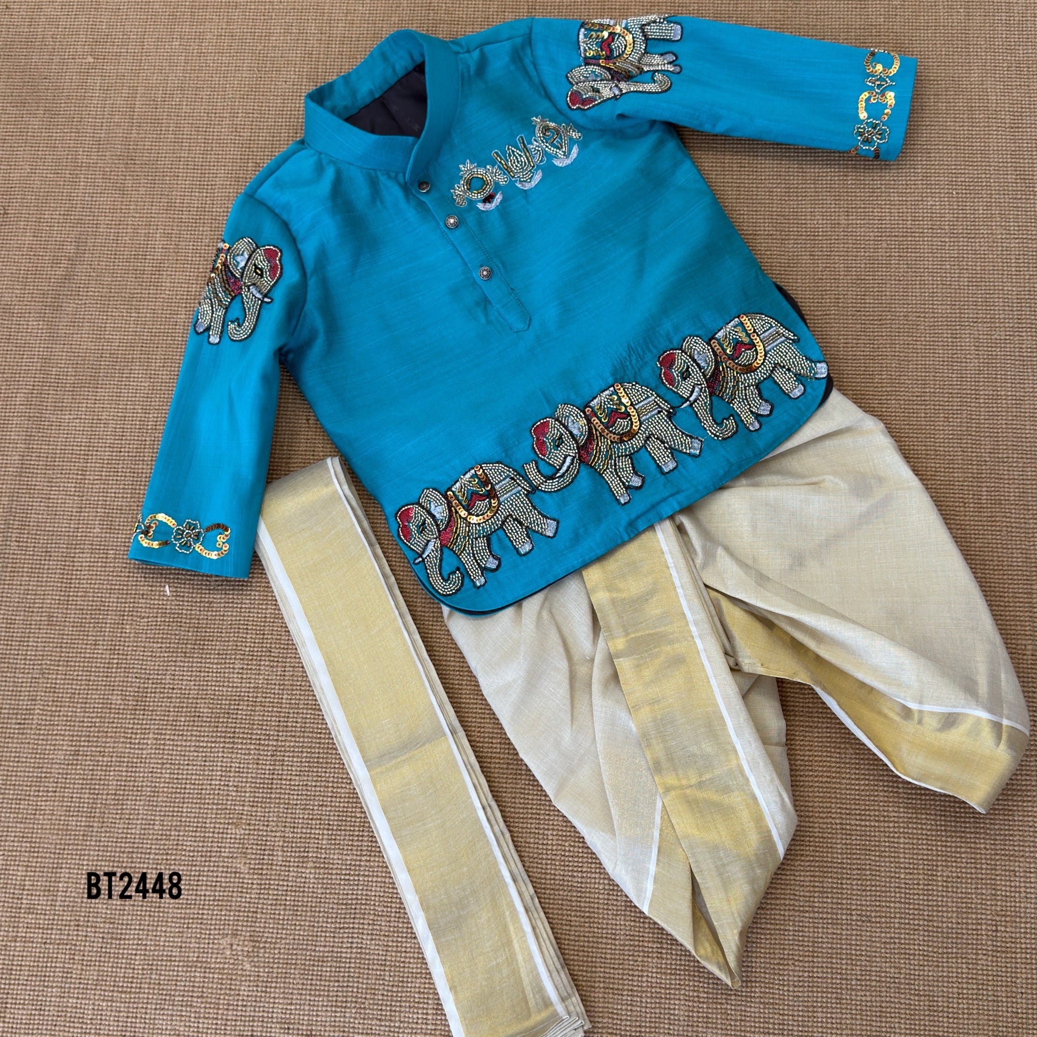 Bring festive elegance to life with this BT2448 Designer Baby Boy Party Wear Dhoti Set, featuring a royal teal-blue top adorned with stunning elephant hand embroidery and paired with a cream-gold dhoti and stole 🐘✨