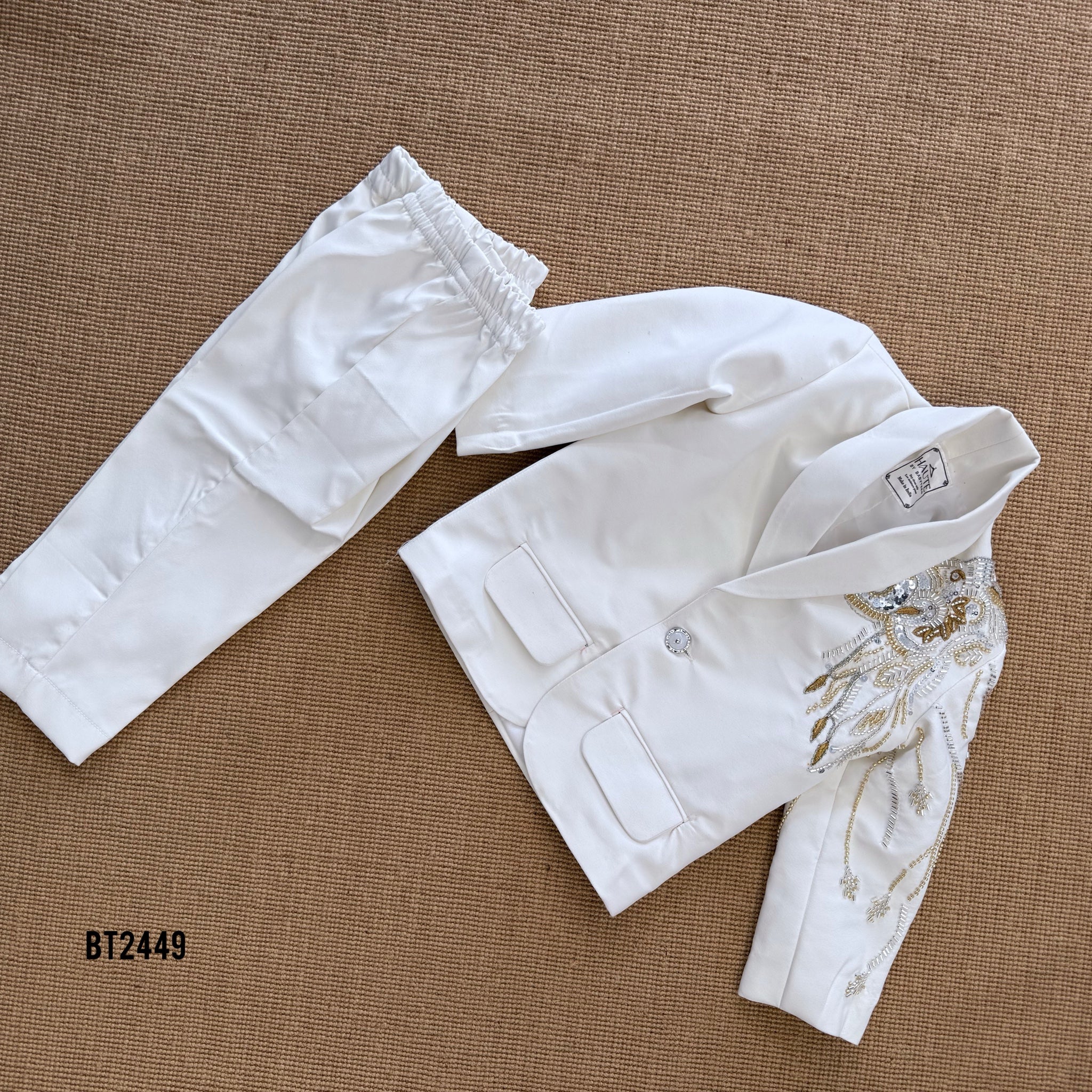 Add a royal sparkle to your little prince’s celebration look with this BT2449 Designer Baby Boy Party Wear Blazer Set, crafted in elegant ivory white with intricate hand embroidery on the shoulder and a charming red bow tie 🤍🎀
