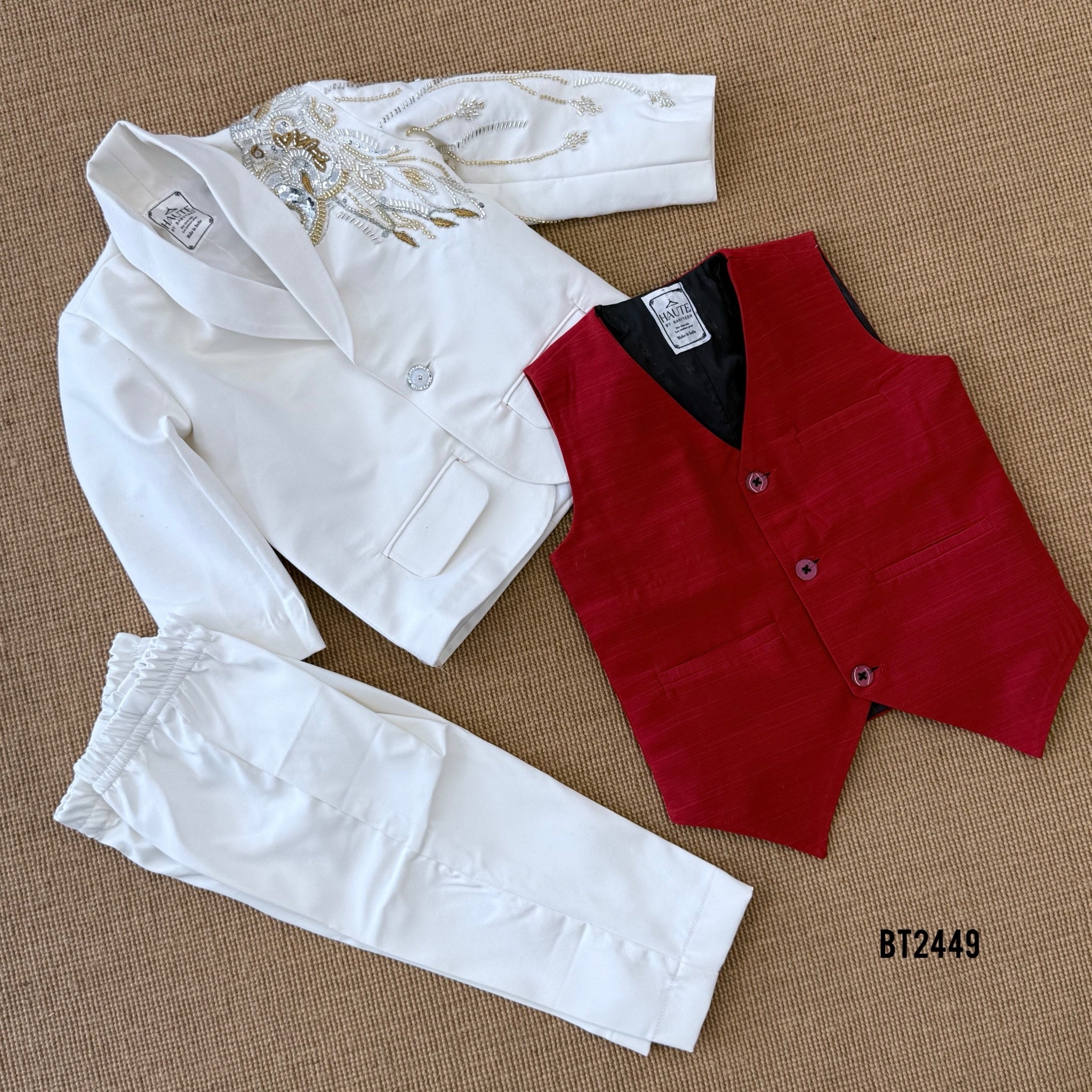 This stunning three-piece set — featuring a white blazer, matching trousers, and an optional red waistcoat — creates a perfect balance of sophistication and cuteness. Ideal for birthdays, receptions, weddings, or family functions, it’s designed to make your baby shine like a star 🌟