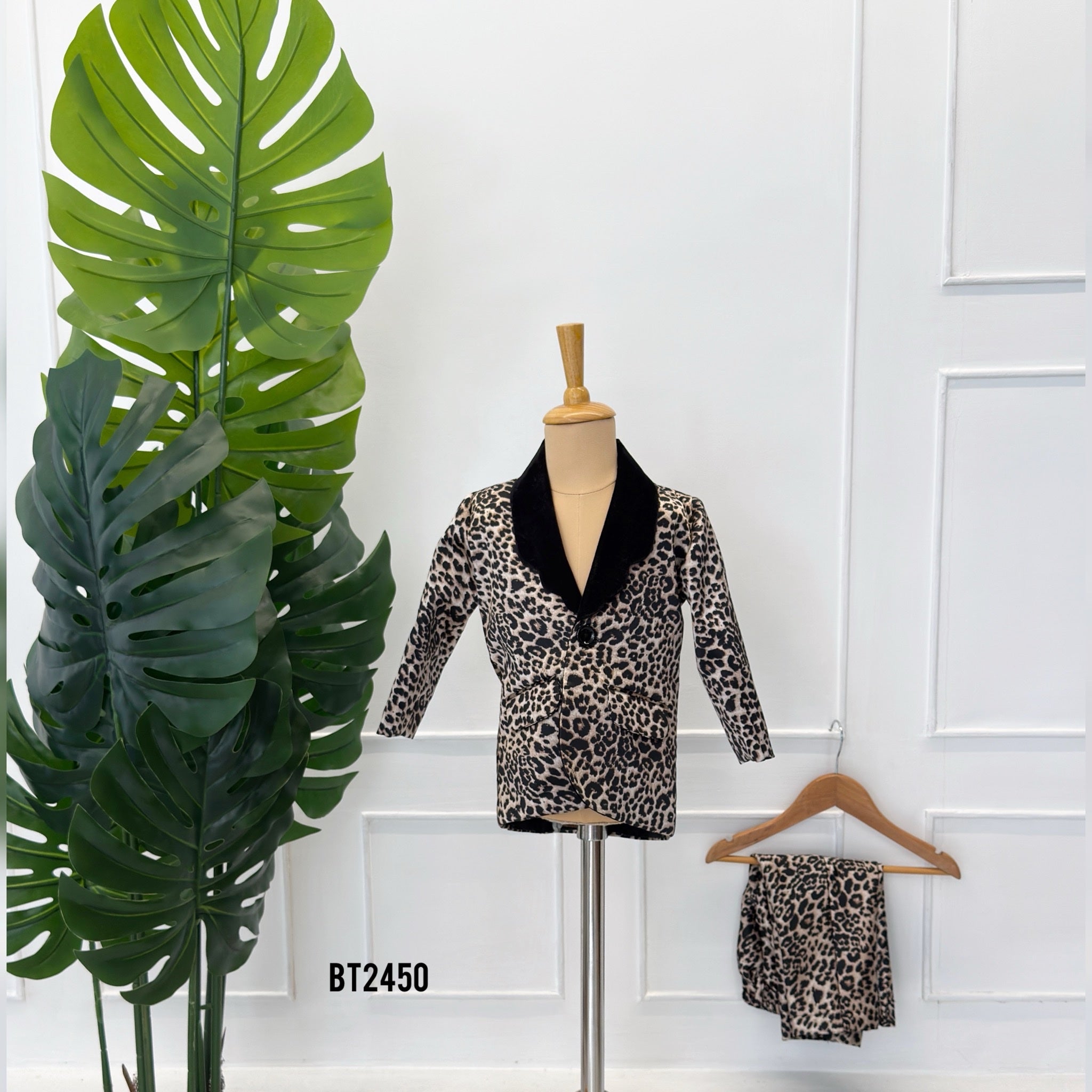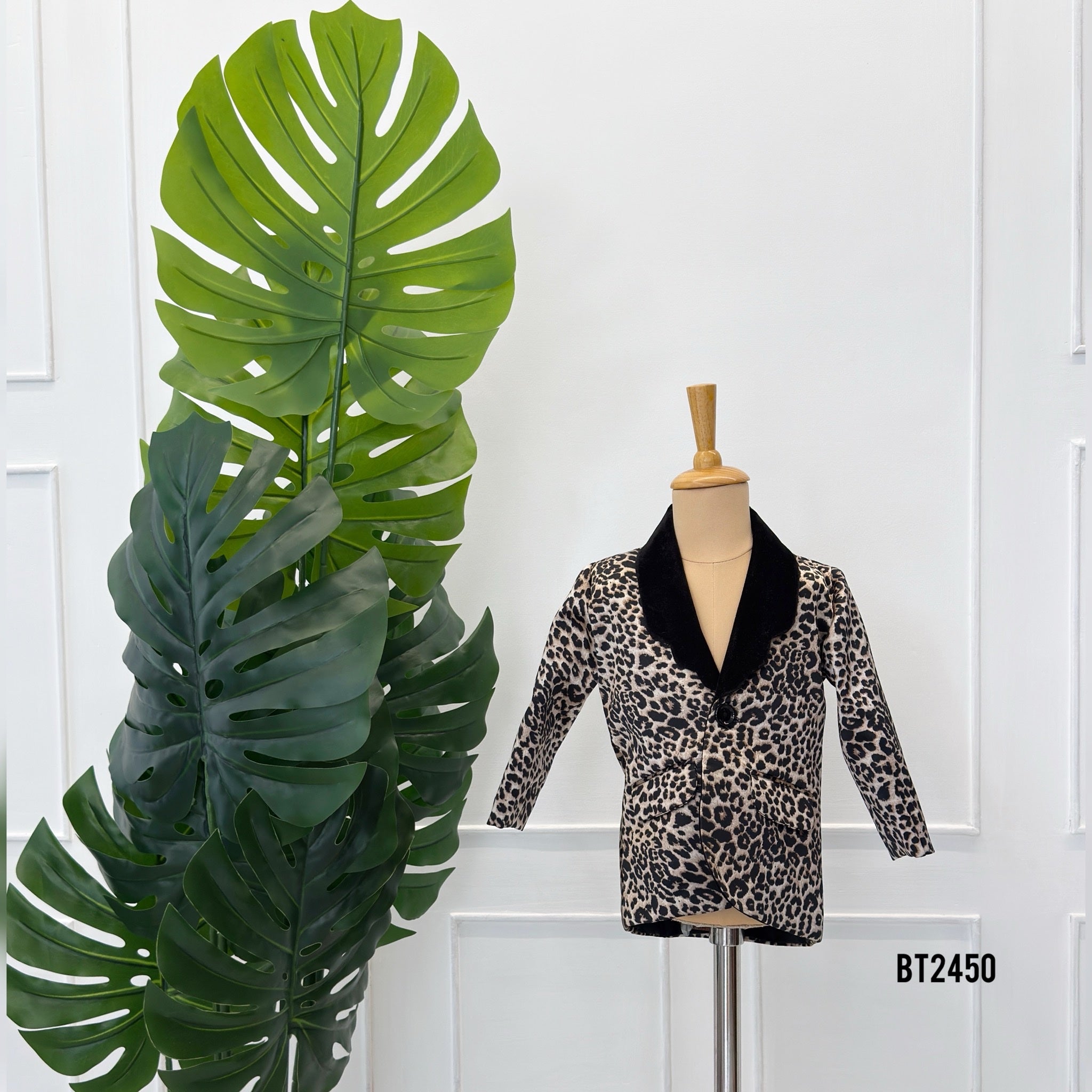 Let your little trendsetter steal the spotlight with this BT2450 Designer Baby Boy Party Wear Blazer, featuring a bold leopard print fabric paired with a sleek black velvet collar 🐆🖤