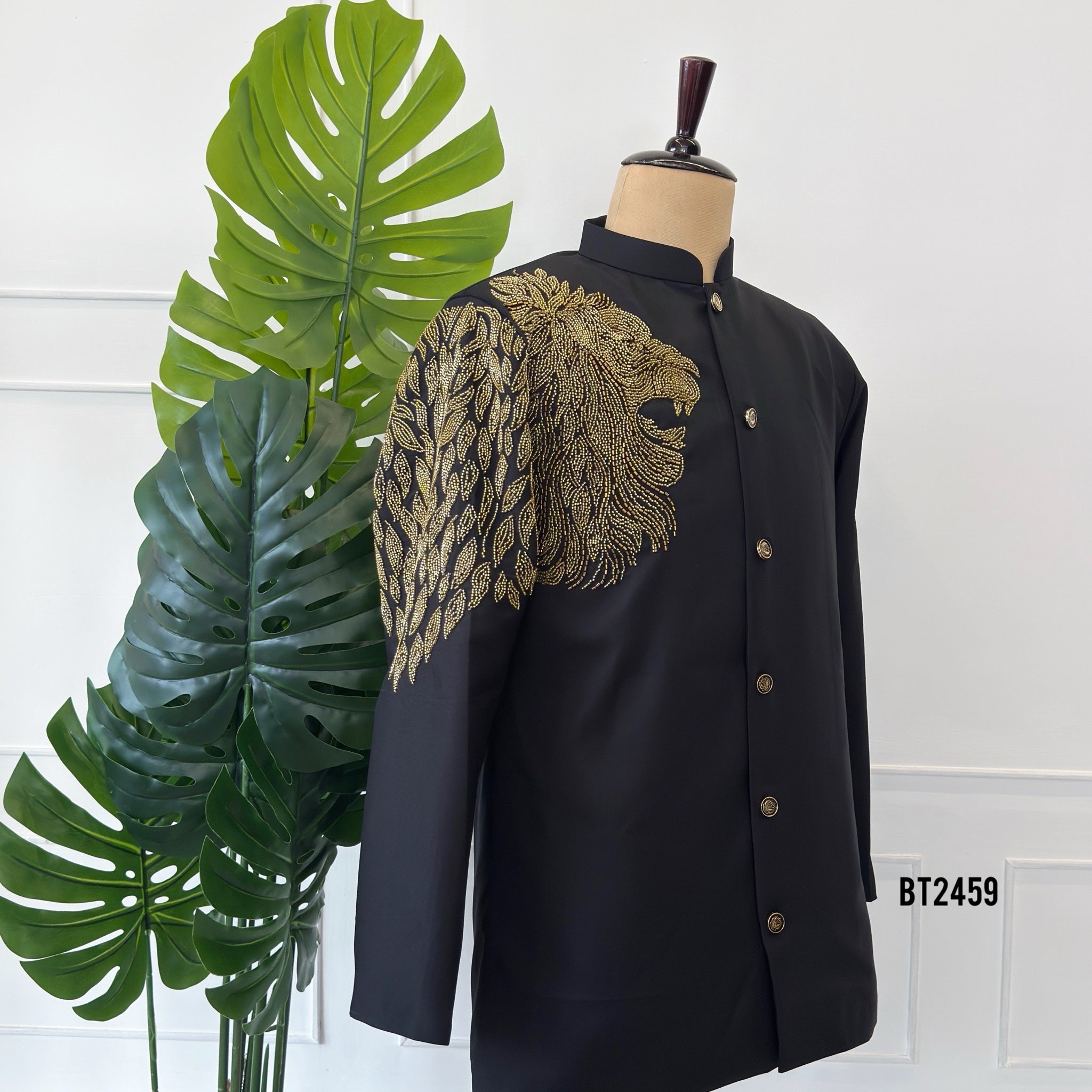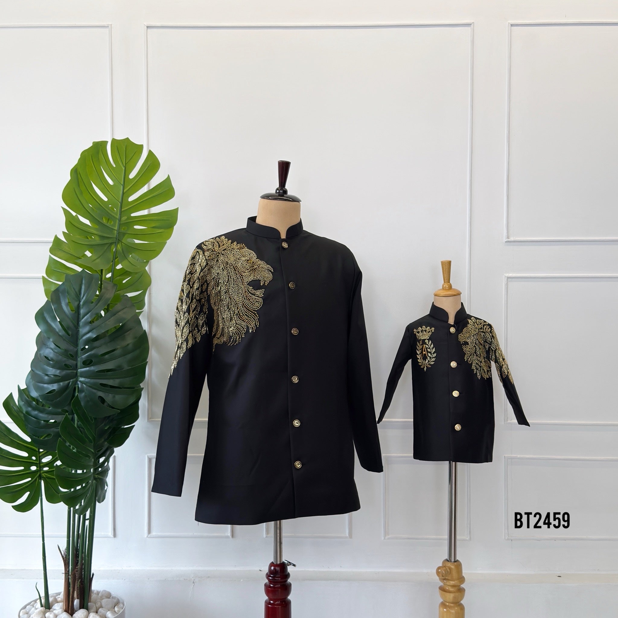 Unleash the royal aura of father-son twinning with this majestic Lion Theme Embroidered Jodhpuri Set 🖤 Designed in classic black with exquisite golden threadwork, the roaring lion motif on the shoulder symbolizes power, pride, and confidence — a true statement of style and bond 👑