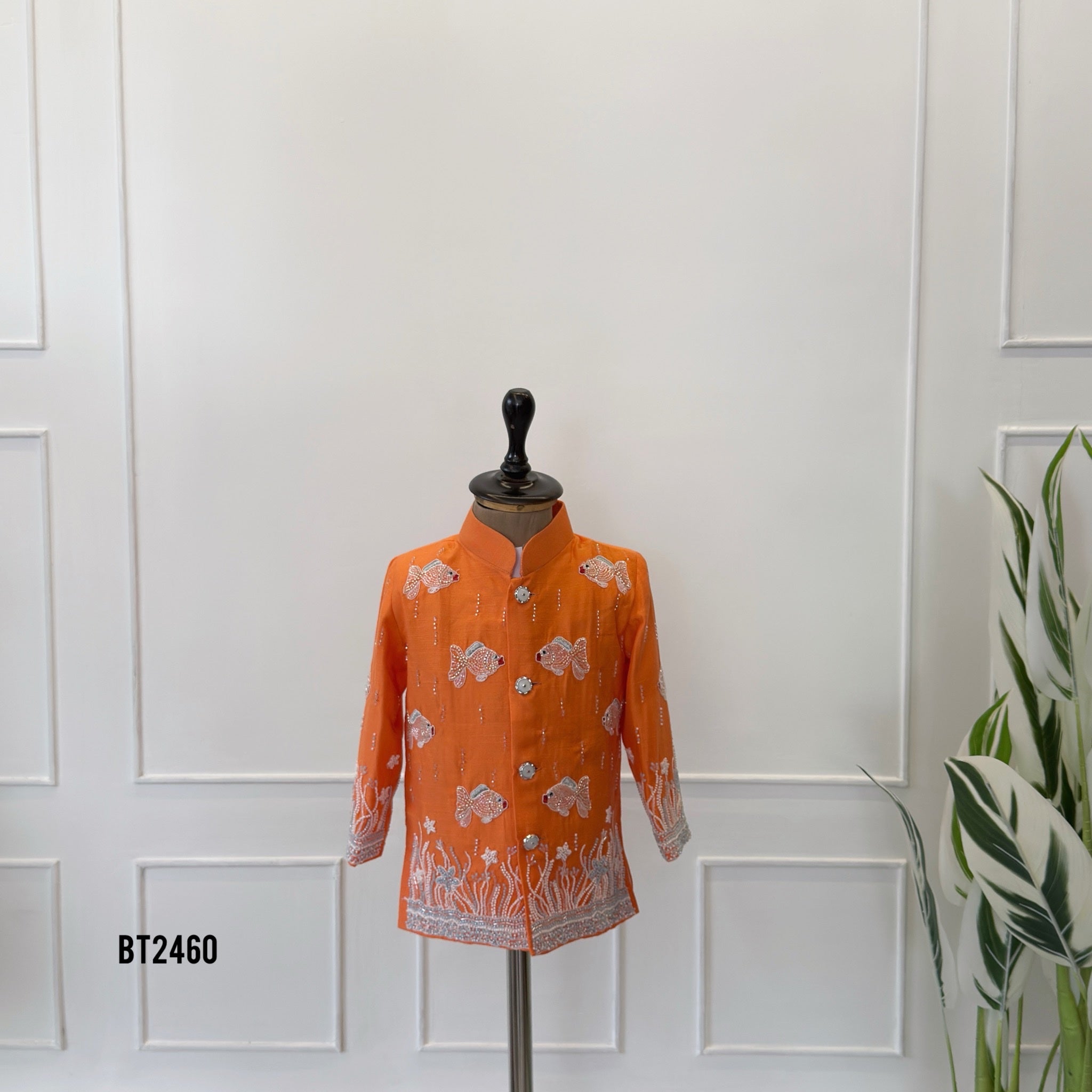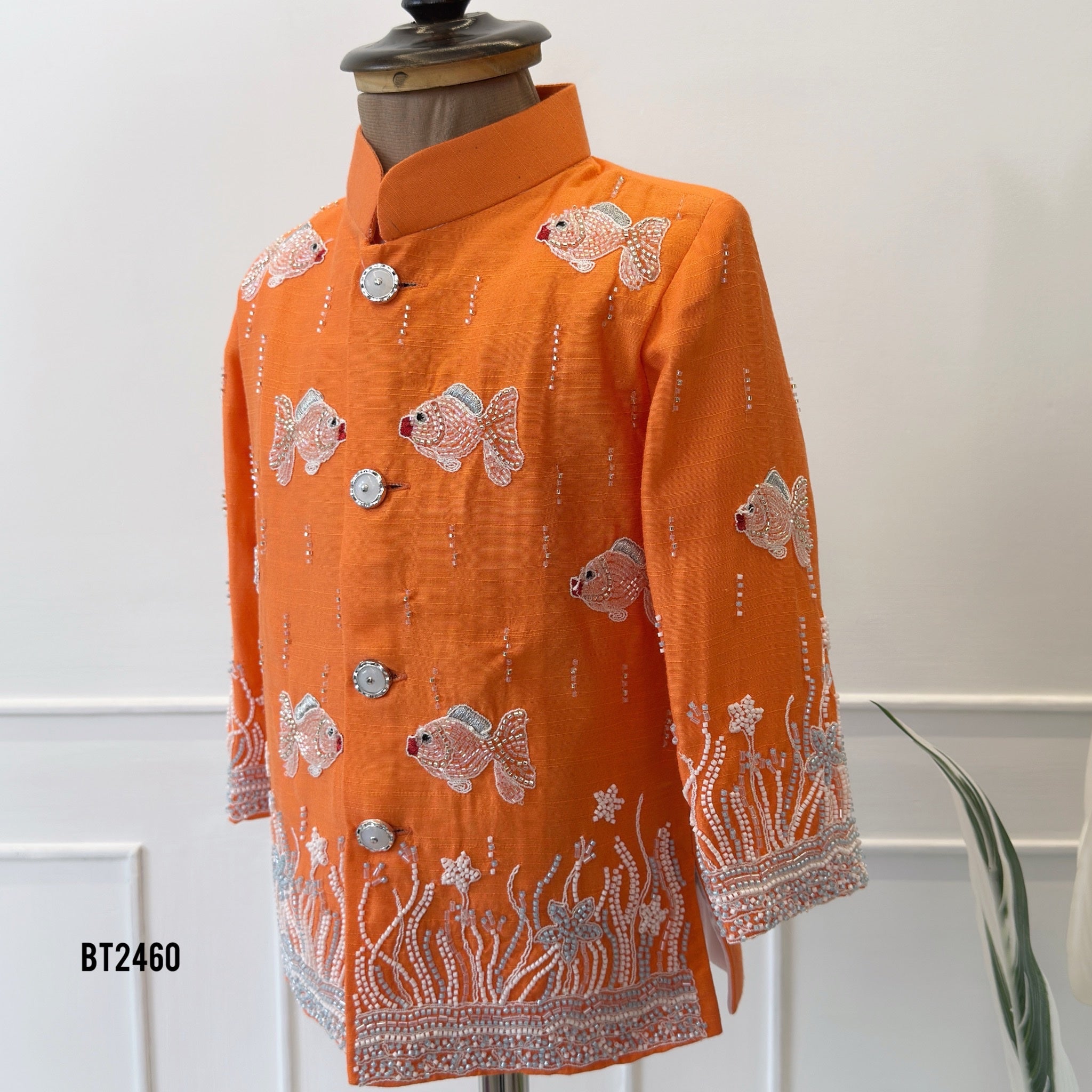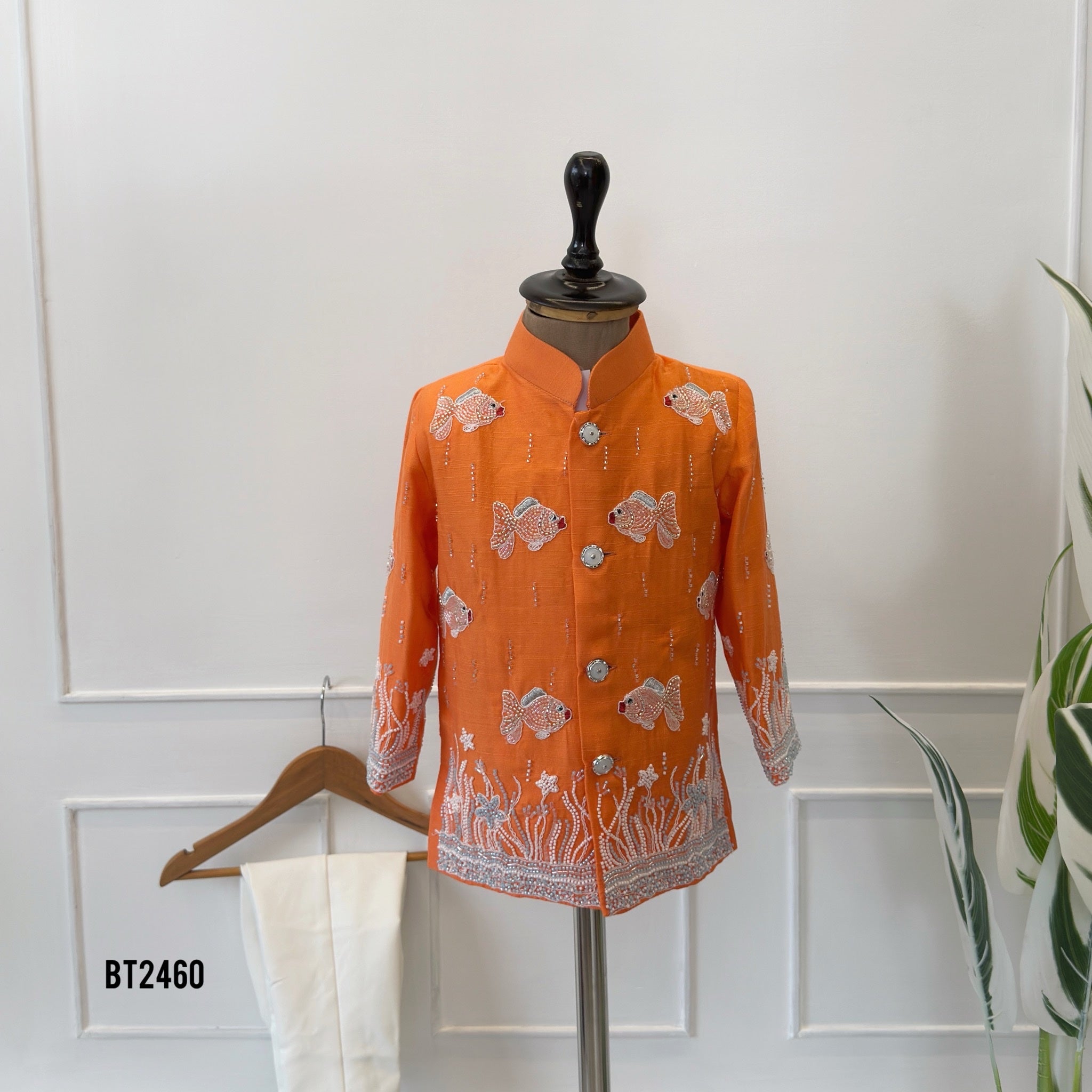 Let your little one dive into celebration mode with this Underwater Theme Designer Jodhpuri Set 💙 The vibrant orange shade beautifully complements the hand-embroidered sea elements — fish, corals, and waves — creating a stunning ocean-inspired masterpiece 🌊🐚✨