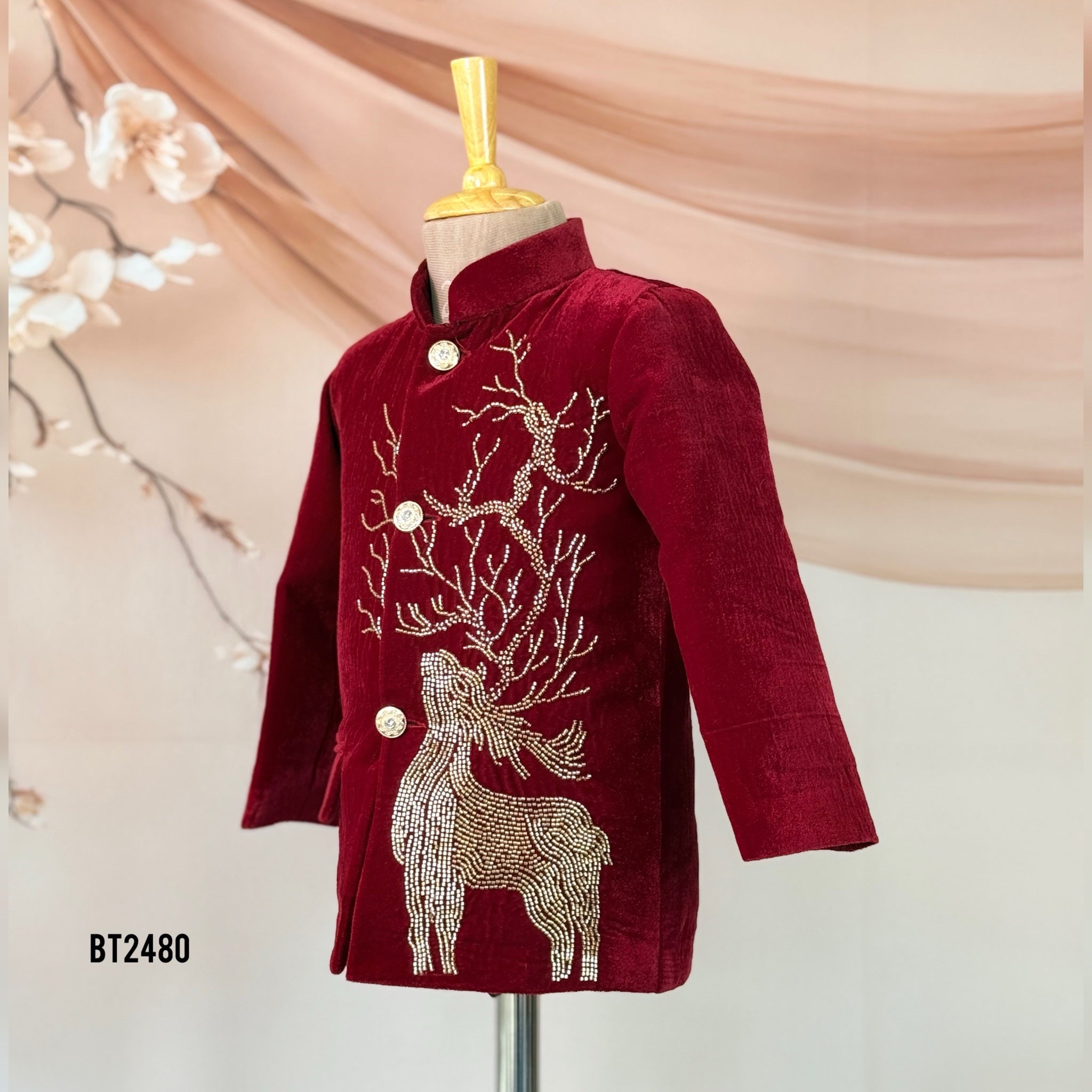 Let your little one shine with royal grace in our BT2480 Majestic Deer Velvet Jodhpuri Suit ❤️✨. This rich maroon masterpiece is a blend of luxury and tradition — featuring intricate hand embroidery of a regal deer, symbolizing elegance, courage, and celebration.