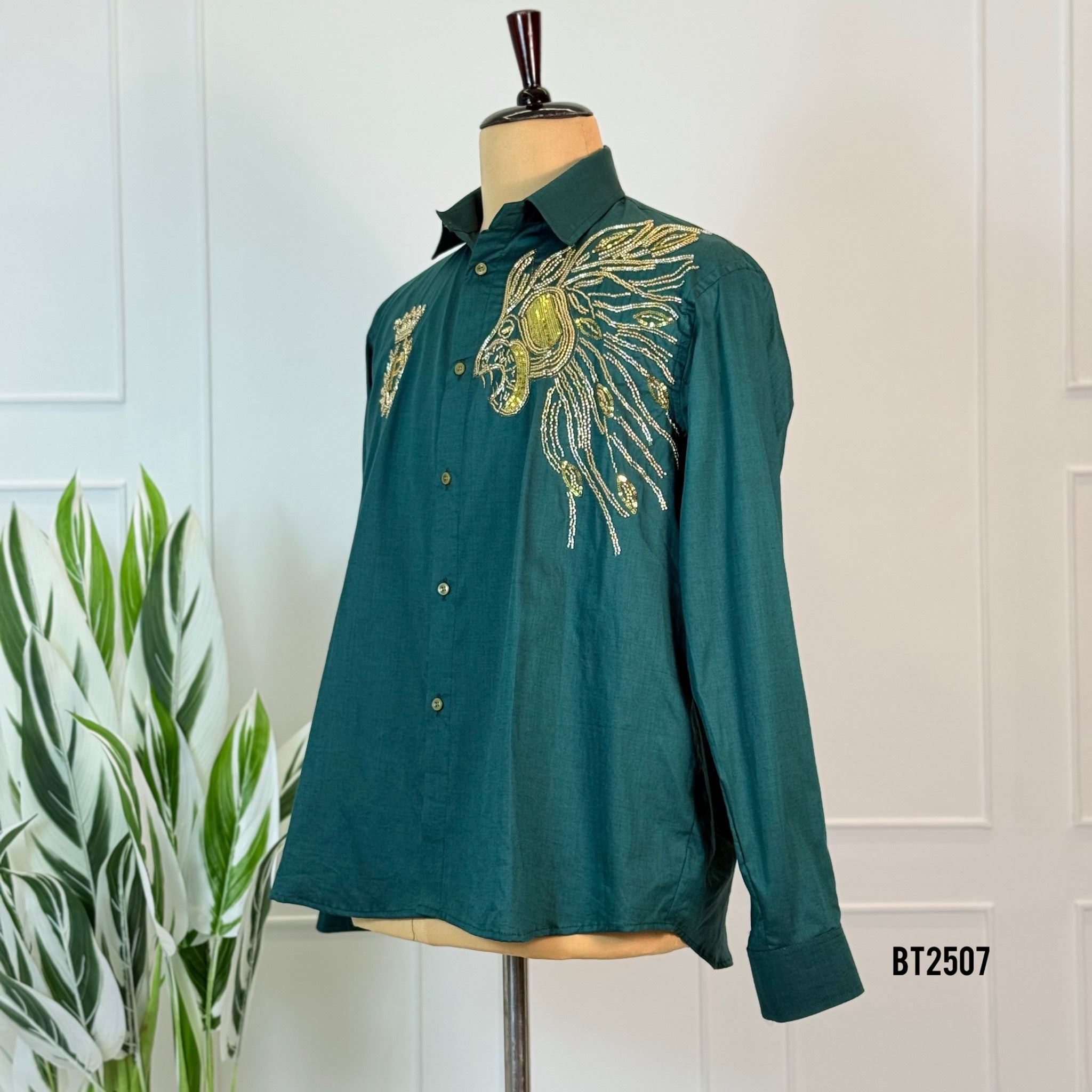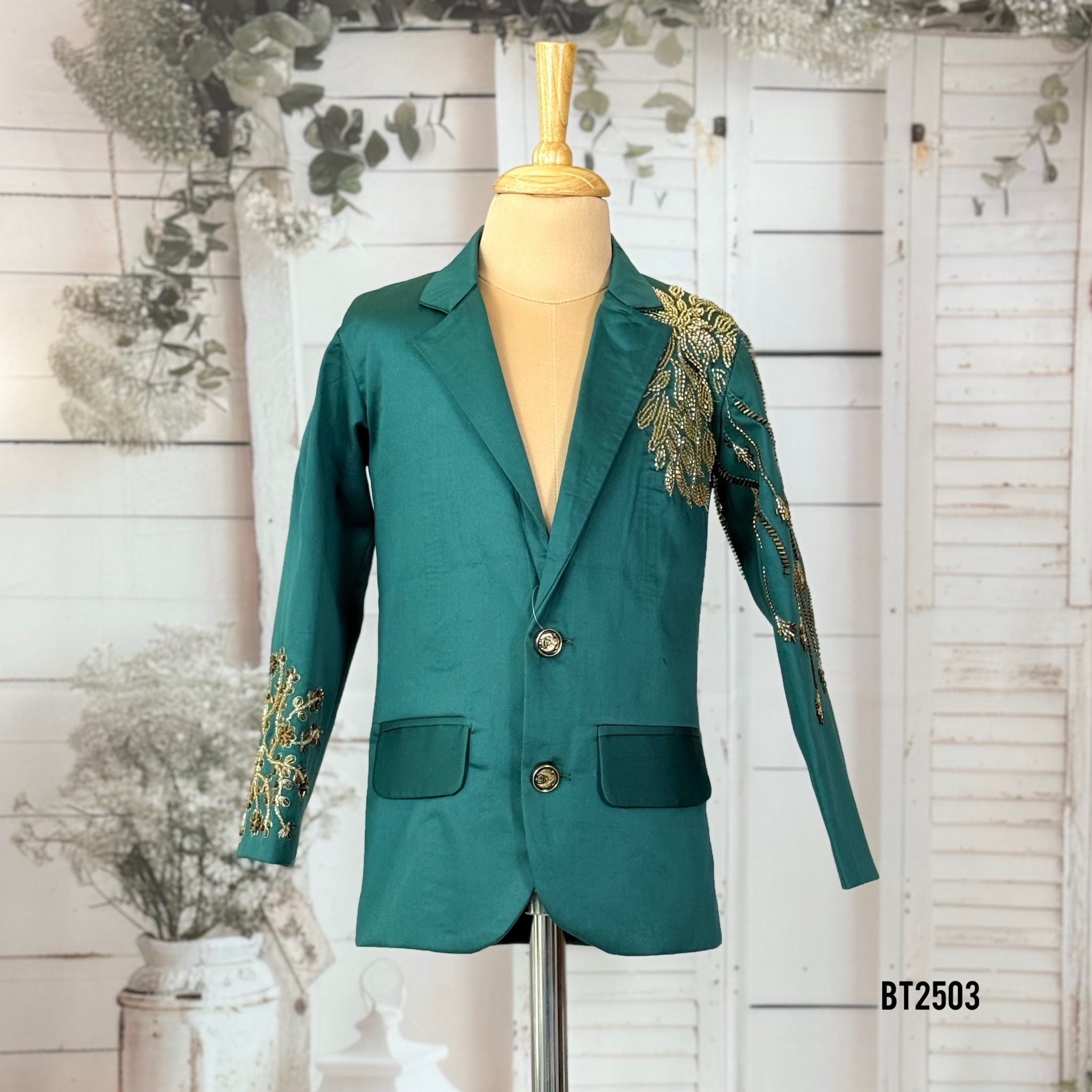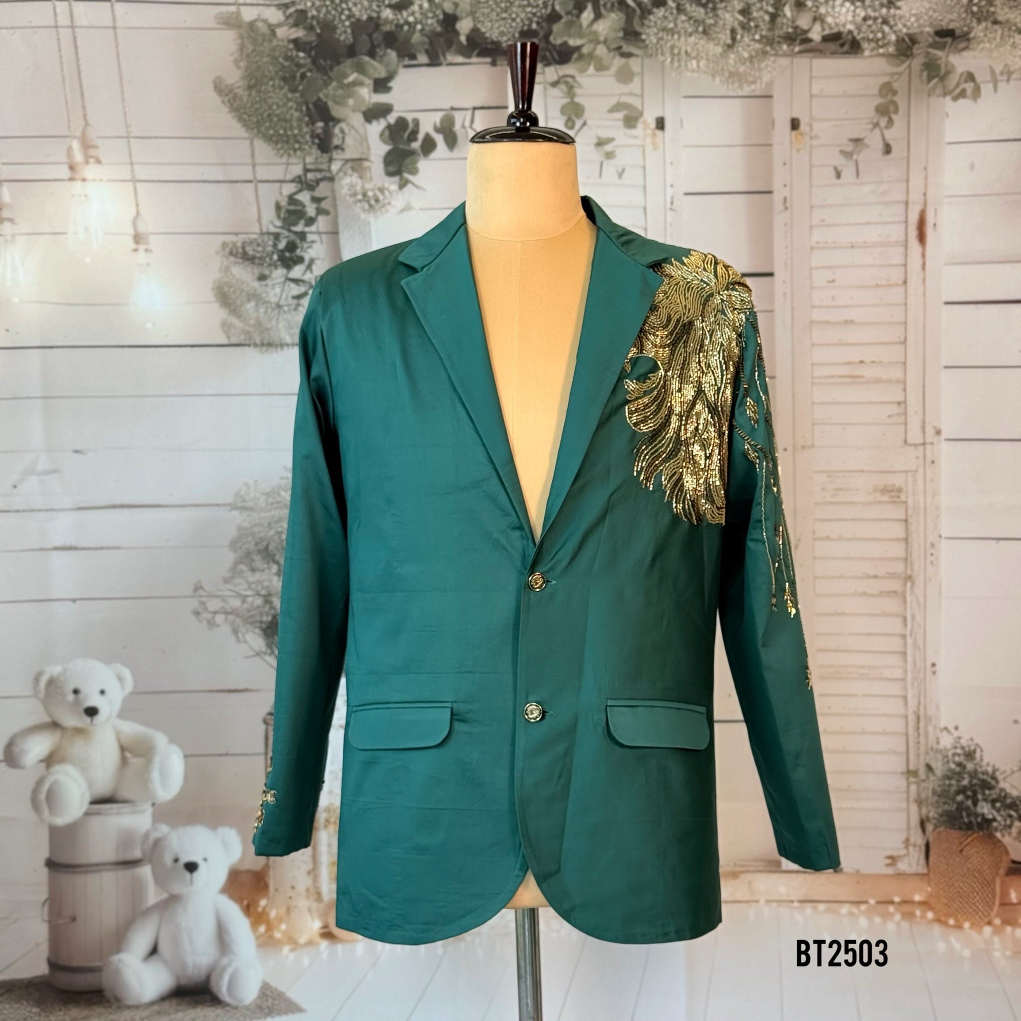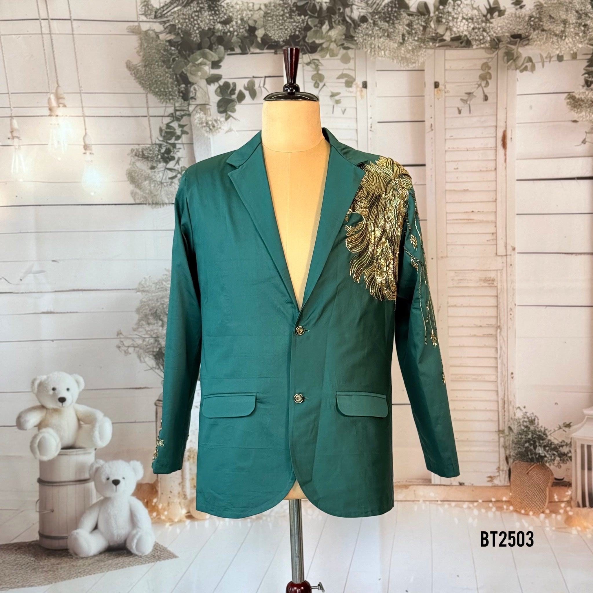 👨 A Dad Blazer featuring majestic peacock feather embroidery on the shoulder and sleeve, blending traditional craftsmanship with modern style.