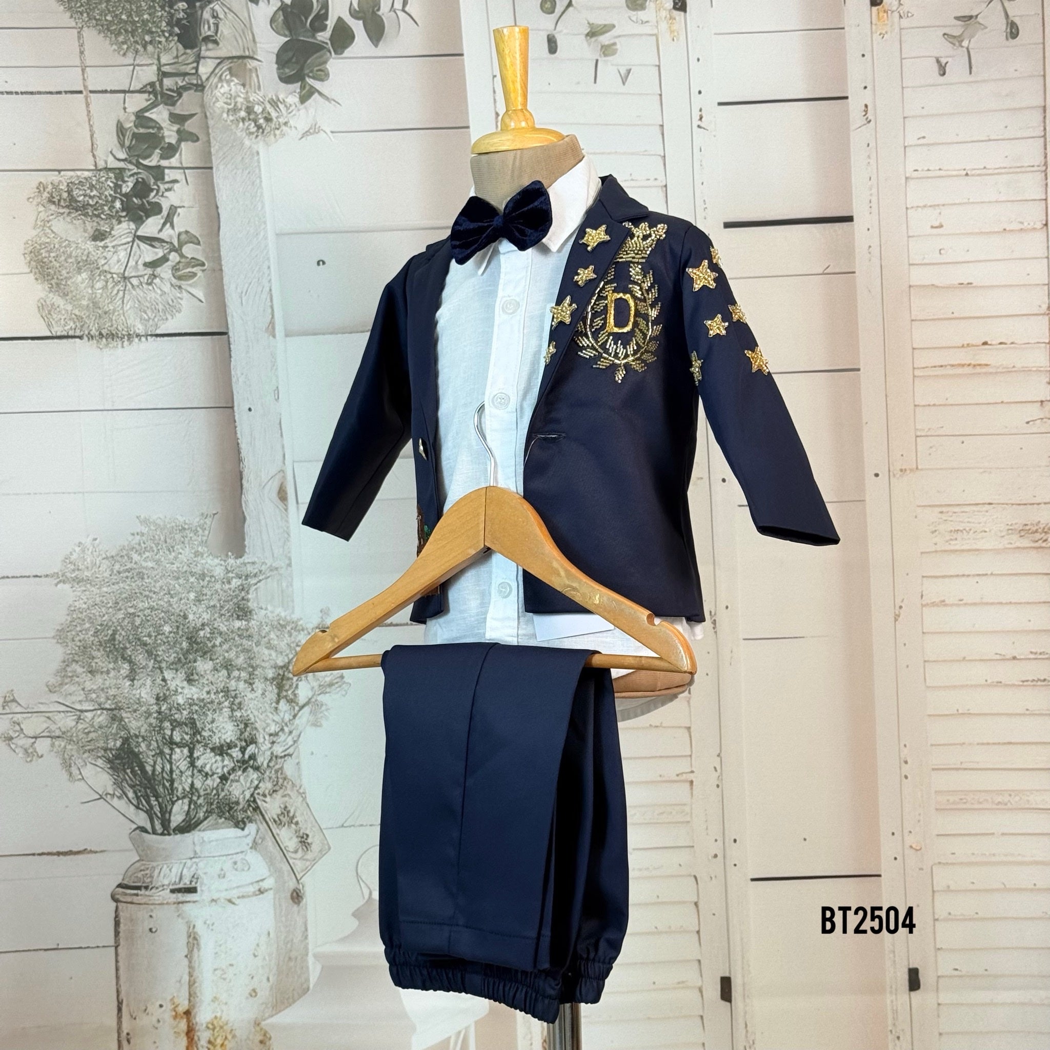 Made from premium black fabric, this designer blazer features intricate golden star embroidery on the sleeves and a royal crest “D” emblem on the chest — adding a regal, show-stopping charm 👑. The single-button front, paired with a crisp white shirt, gives it a classy and elegant look perfect for birthdays, weddings, receptions, and festive events.
