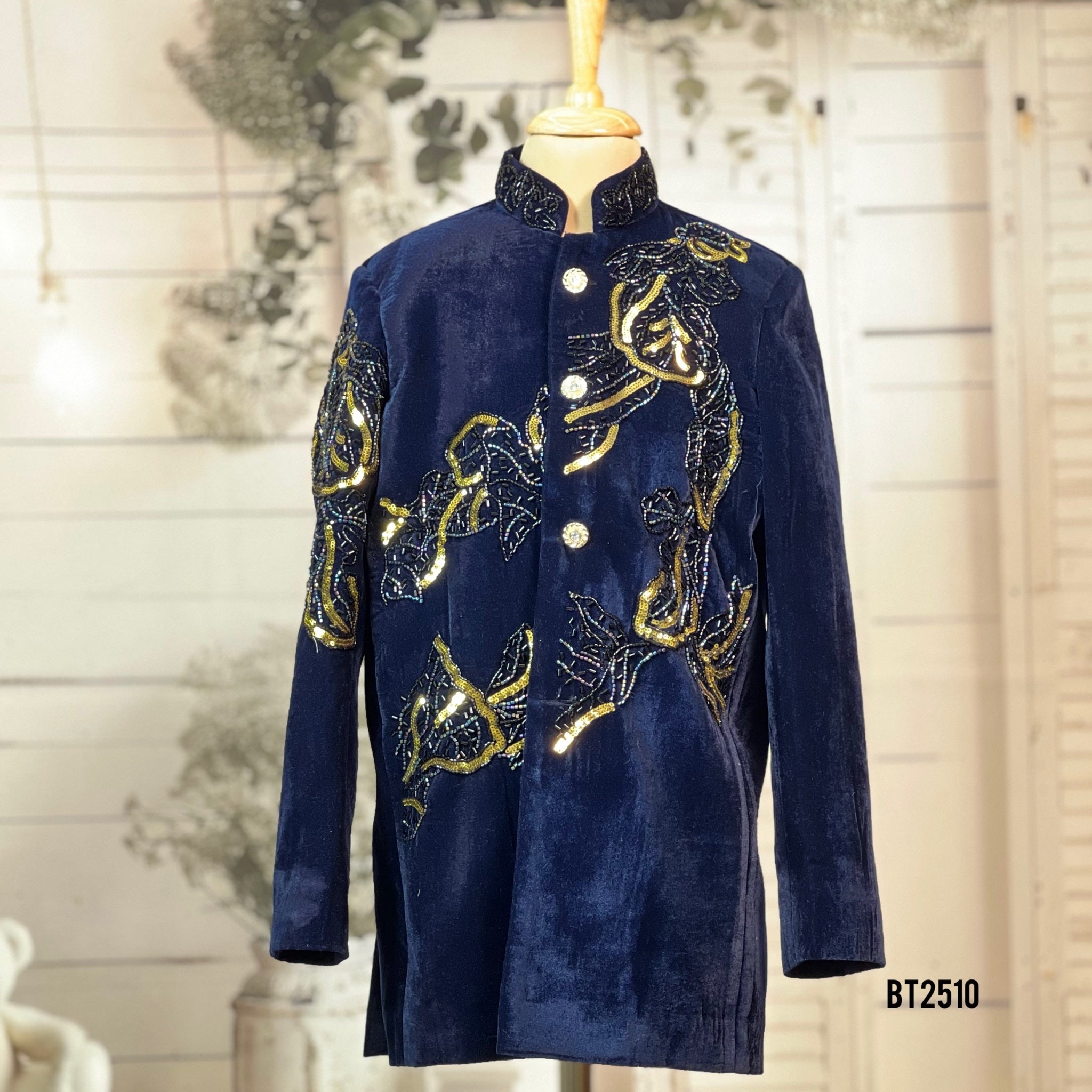 BT2510 brings a luxurious navy blue velvet sherwani combo with stunning gold bead & sequin embroidery — a look that announces royalty in every celebration 💫