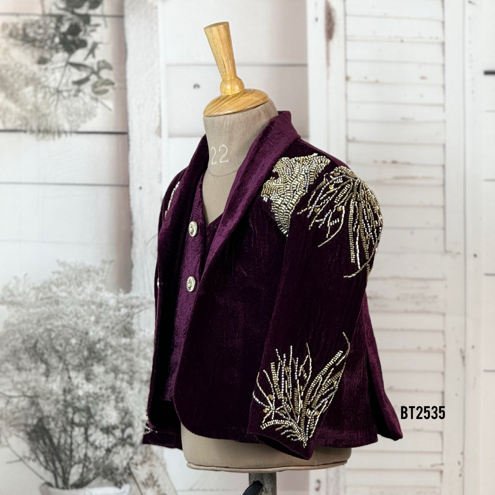 A royal outfit designed to celebrate your little prince in true luxury 👑✨ This stunning maroon velvet blazer set comes with a matching waistcoat, highlighted with grand gold bead embroidery — giving a rich heritage look that captures every heart ❤️